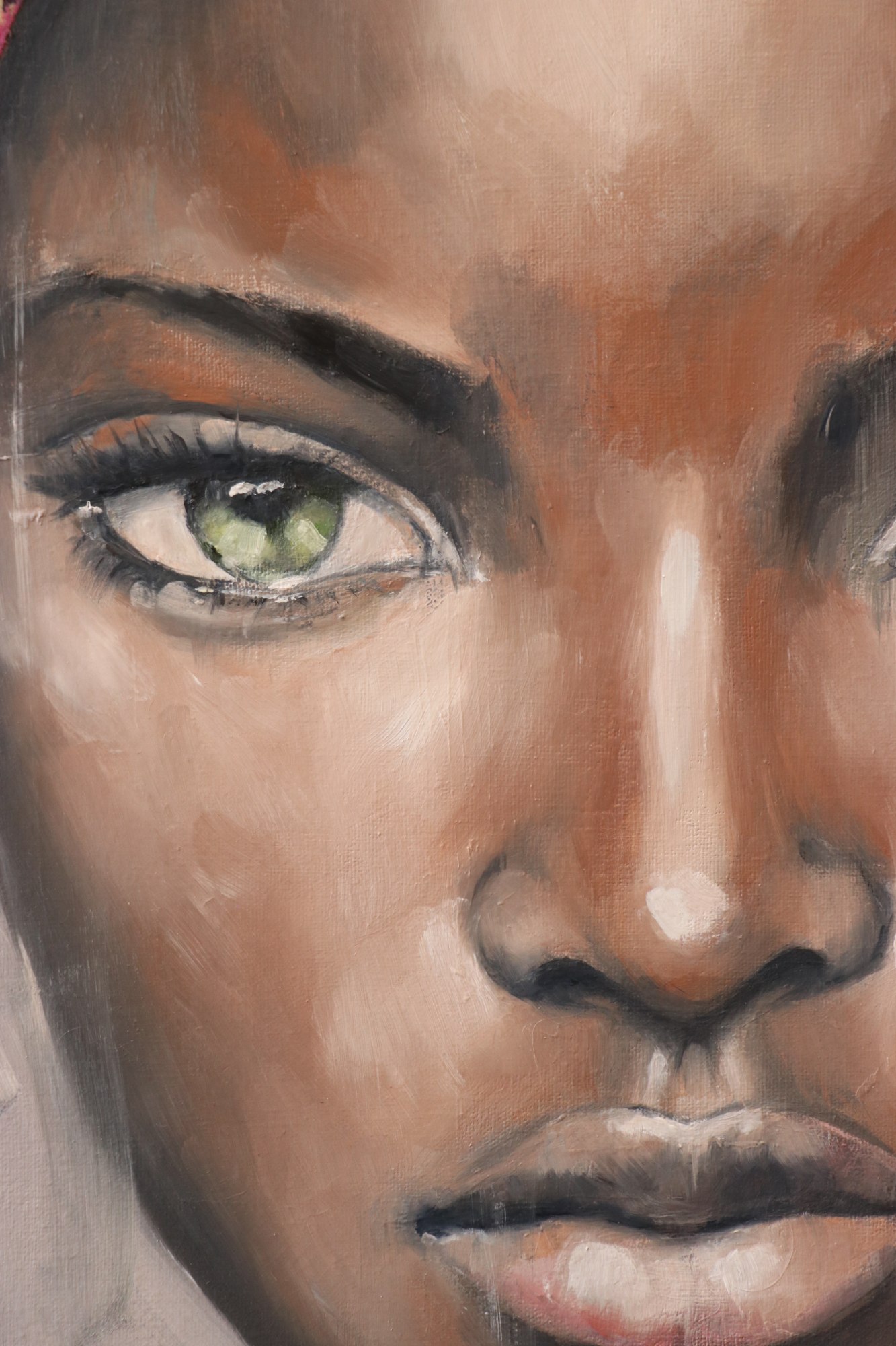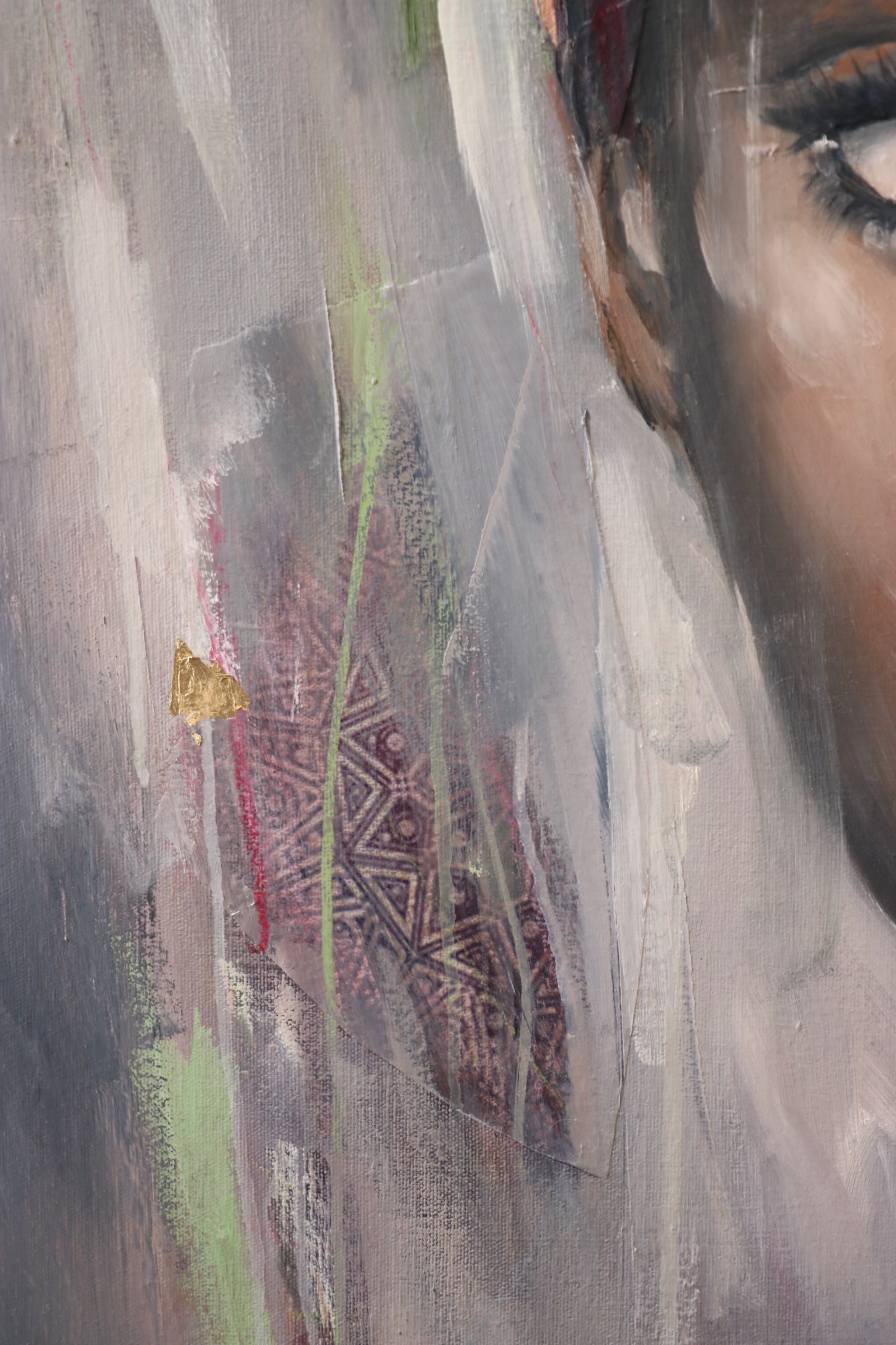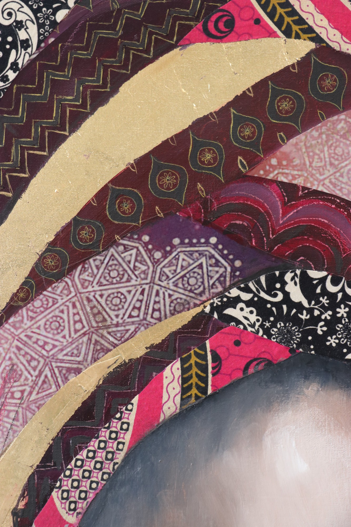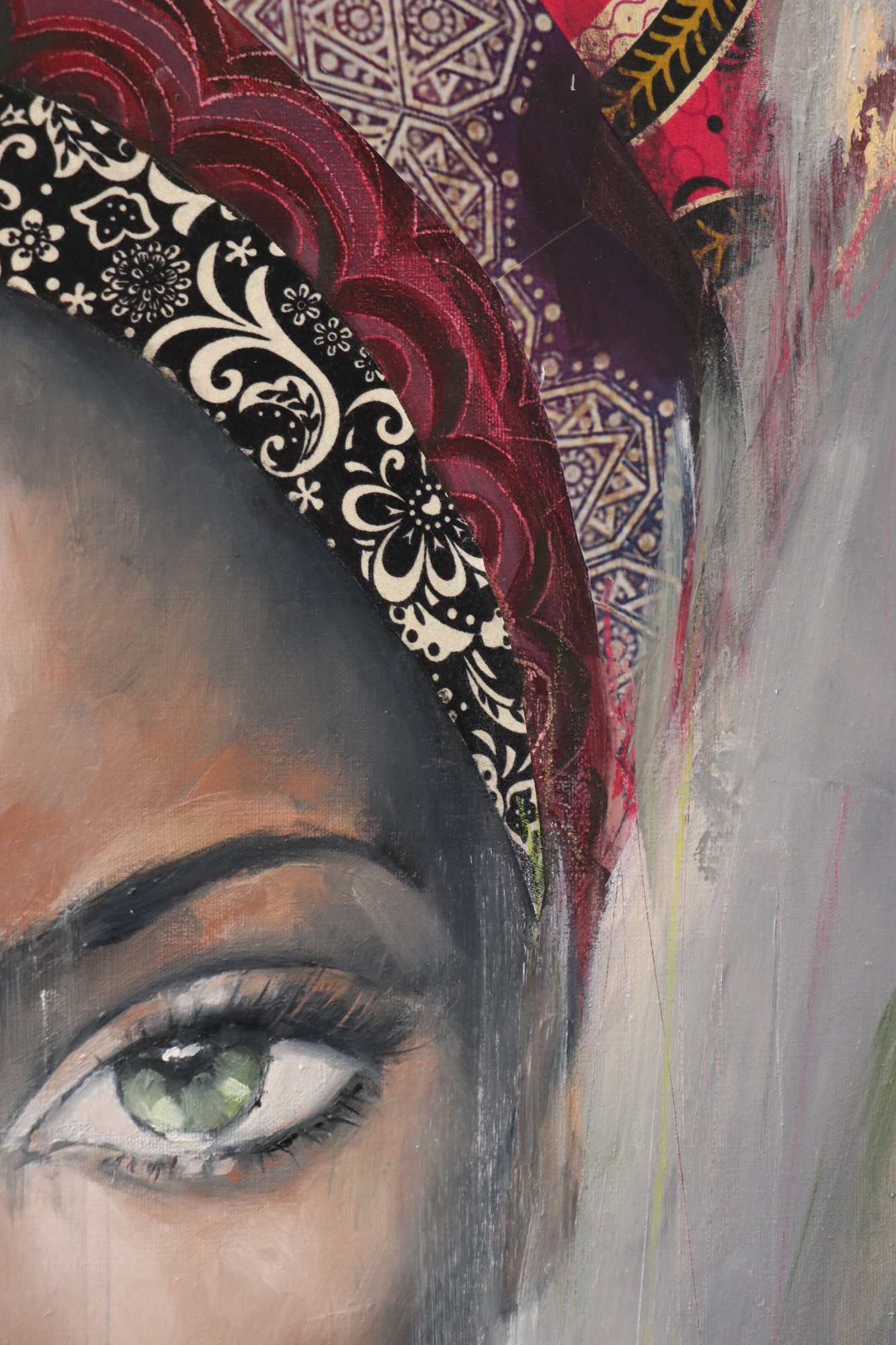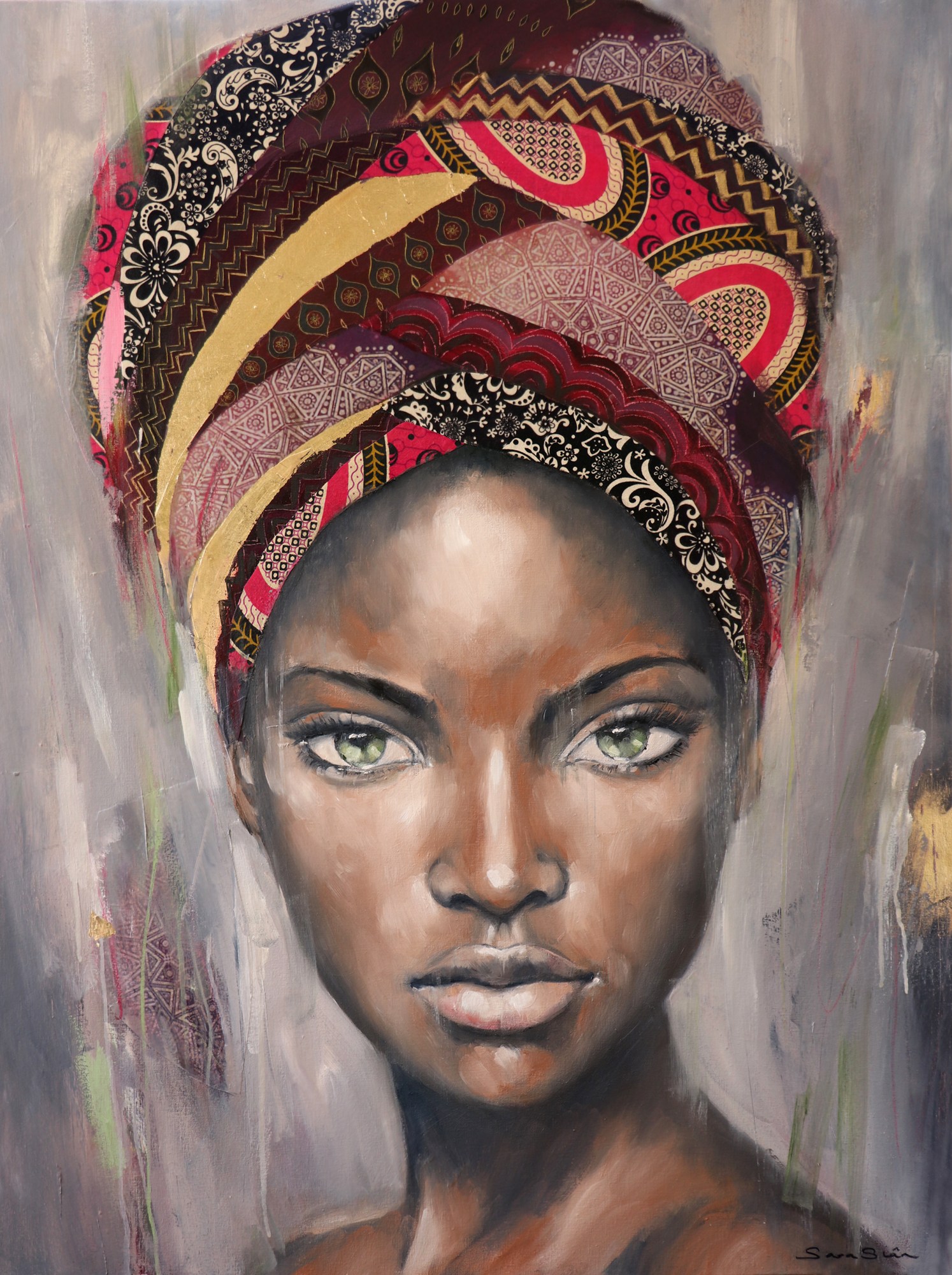 African woman with colourful head-dress made from fabric, collage & painted elements.