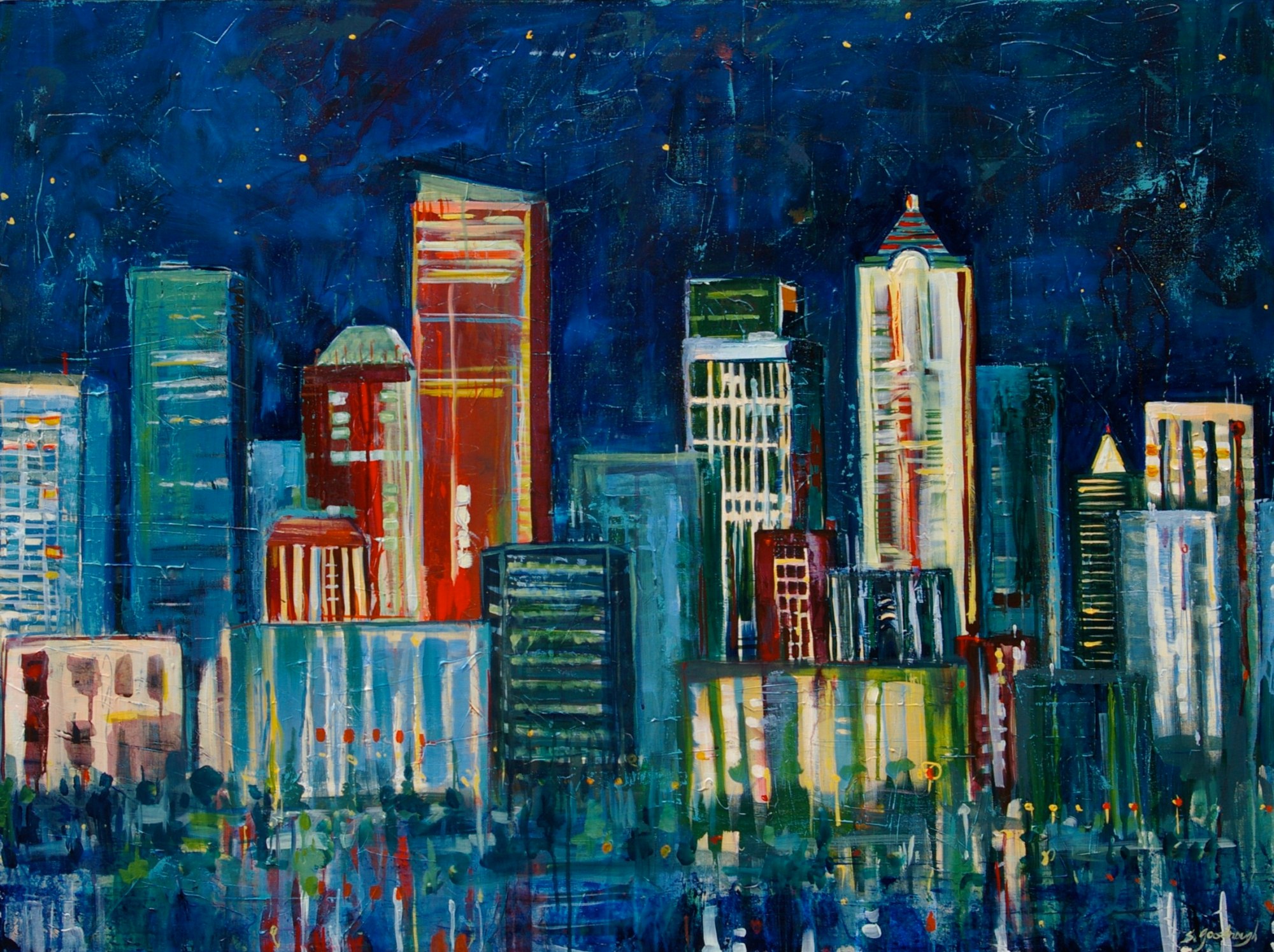Evening cityscape of multicolored skyscrapers in Portland, Oregon under a dark blue sky. Yellow, red, green, orange and various shades or blue are present in the scene.