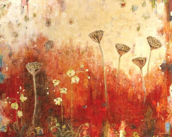 Yellow and brown plants and flowers pop up from the bottom of the piece. A light yellow top fades into an orange and red background.