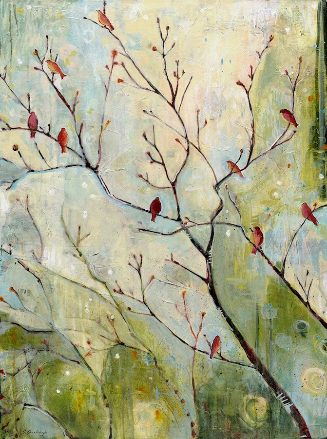 Red and orange birds perched in thin dark colored tree branches. Background is blend of light blues, tan, and greens.