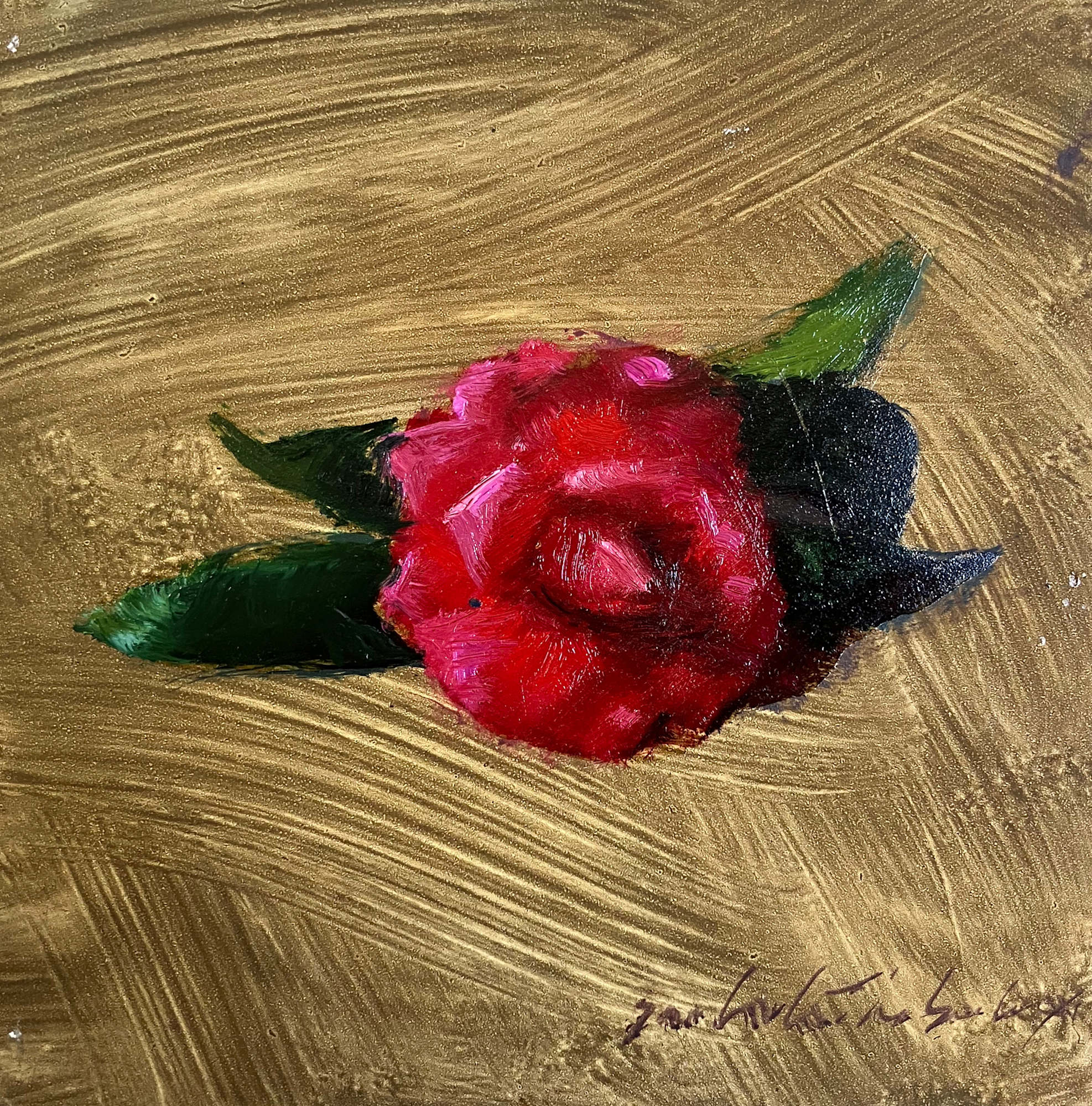 This small work of a single blossom celebrates the singular beauty of a spring flower with the bright pink and the rich green of the petals against a spare transparent wash of earth color. A fresh statement of spring, of life bursting forth.