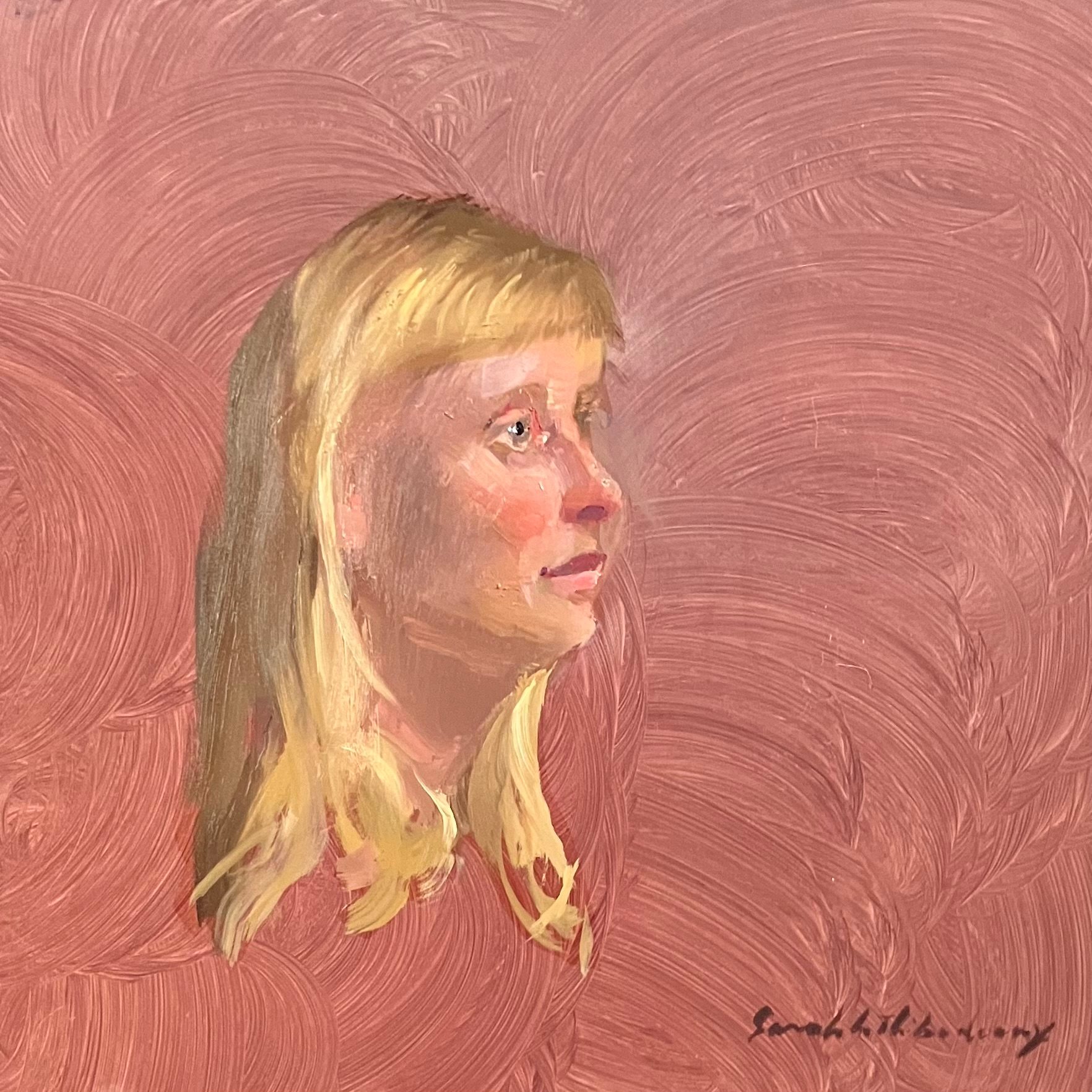 The artist continues to explore the improvisation of the portrait painted from life. The energy of this experience is rich and the transparent pink/red background resonates through the flesh tones through her upward gaze and anticipatory expression suggesting hope and joy through these simple strokes of paint.