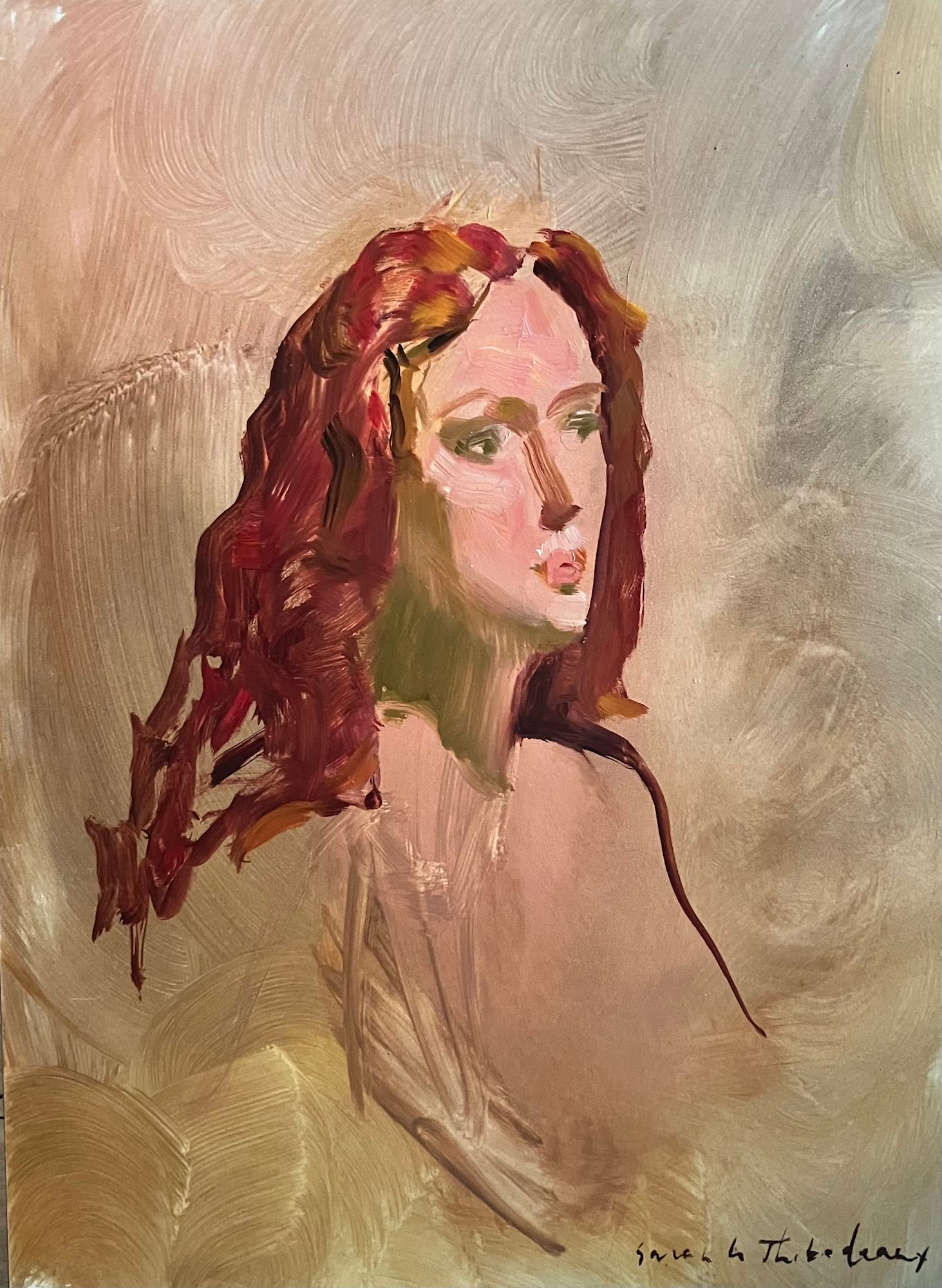 The painting “Wondering” is a painting with an etherial quality. Made with just a few brush strokes, it evokes a madonna in contemplation. It has a gentle expression. It allows the viewer to contemplate, to feel. For others it can have its own meaning, but for the artist it evokes the compassion of the mother to the child. To the suffering of growing up, falling down, and witnessing it all.