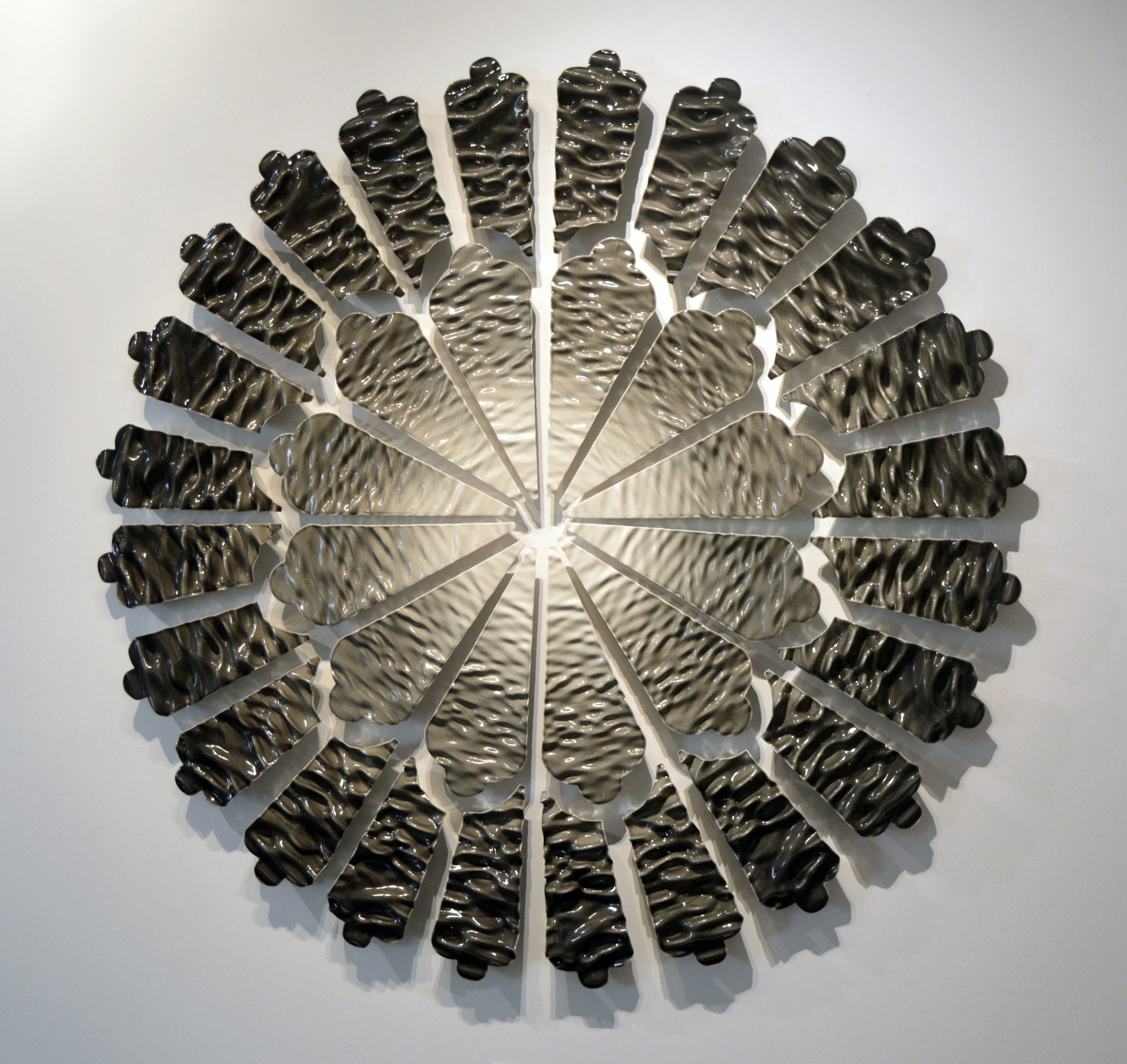 This piece uses the geometry of the rose window from the Notre Dome cathedral to divide a gradient of rippling water. The grayscale finish acknowledges how rose windows are usually very colorful and filled with religious imagery. Reduce Me to Silence suggests finding a moment of emptiness, meditating on the fading rippling water.