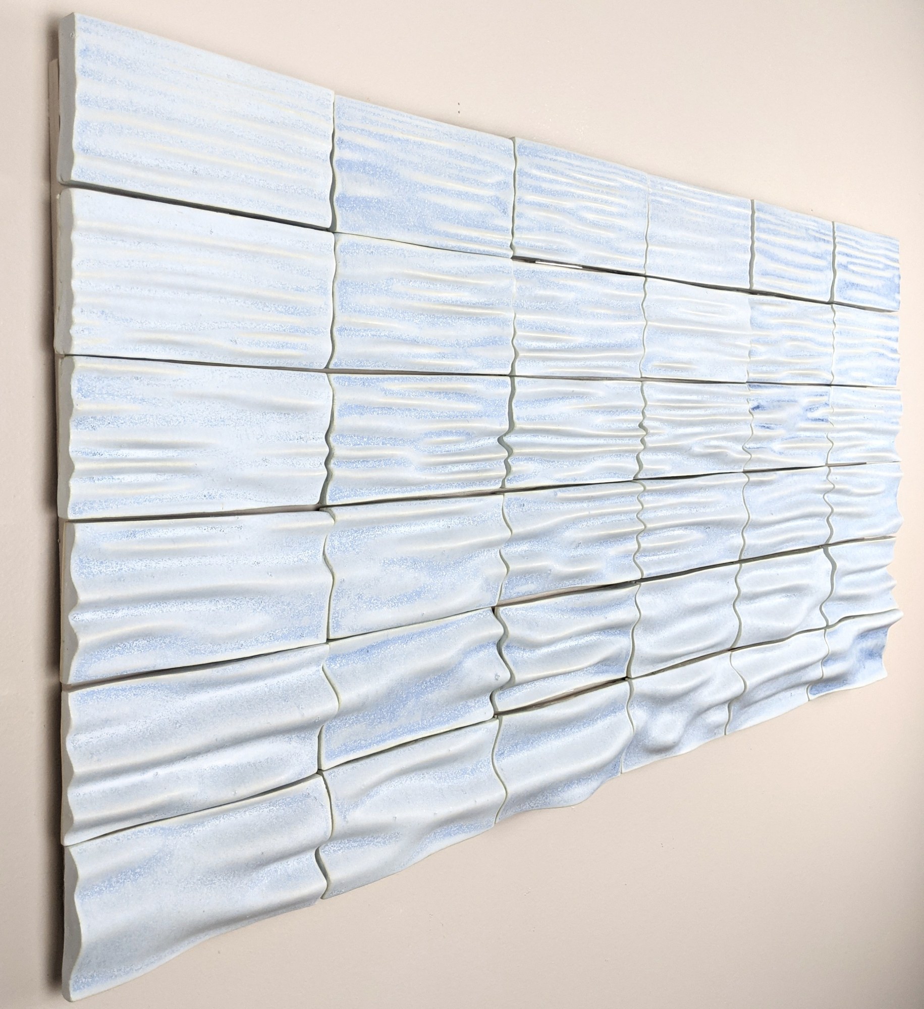 This piece is beautiful to meditate on, with a soft light blue glaze and field of rippling movement. The composition creates a landscape of rippling water, with a scale shift from bigger ripples on the bottom, to smaller ripples at the top, as if they are moving away from you.
