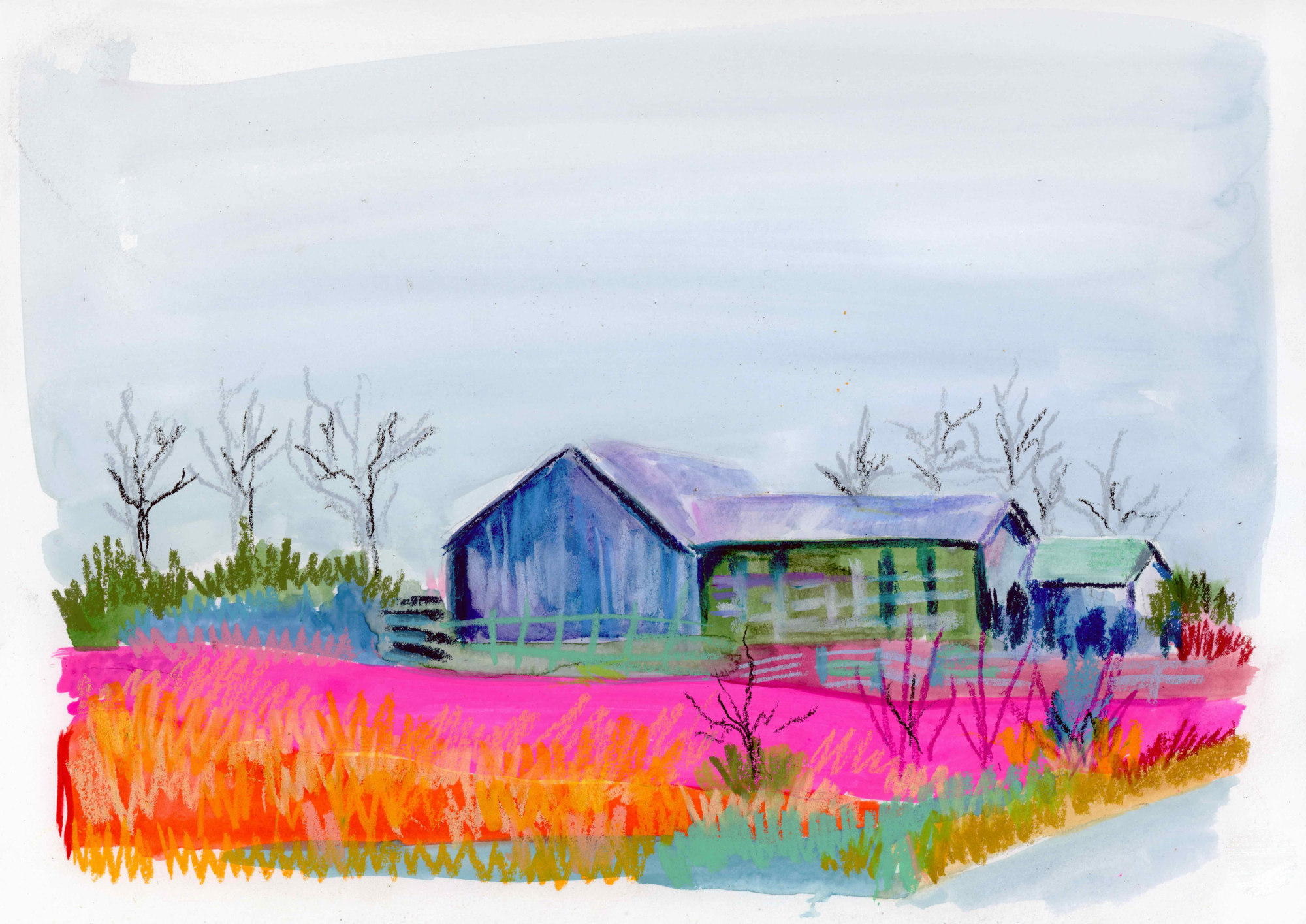 RAY ROAD BARN Sarah Jaynes Gouache and pastel on paper 9x12 2024