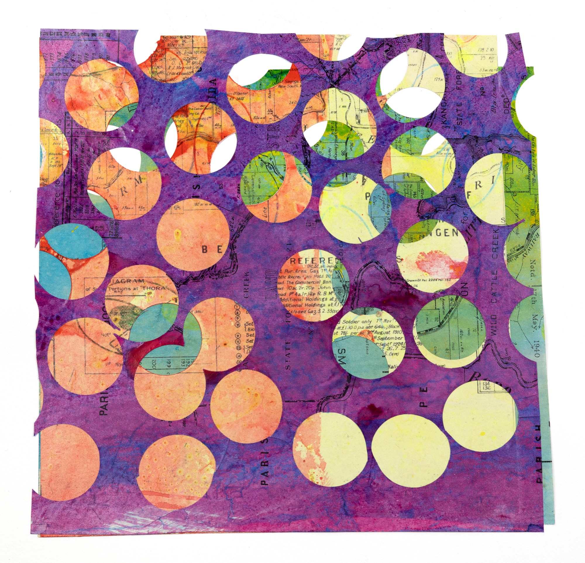 Found vintage paper, india ink, pigmented ink, and polymer gesso on rag paper