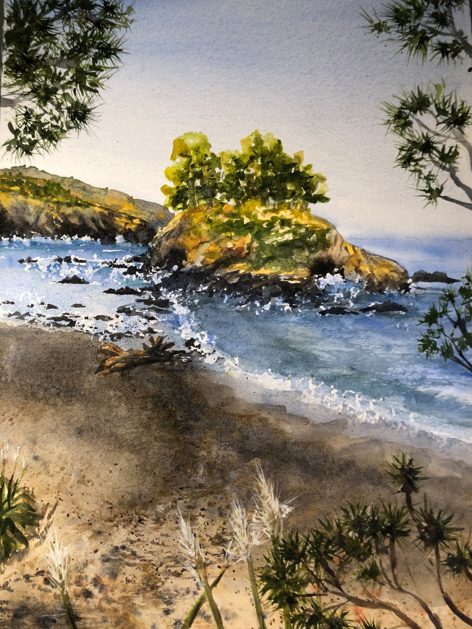 In “The Path to Buckhorn Cove” painting, I used a dry brush to apply green apatite genuine to create the pine needles on the trees along the path. The rest of the painting uses the wet into wet technique.