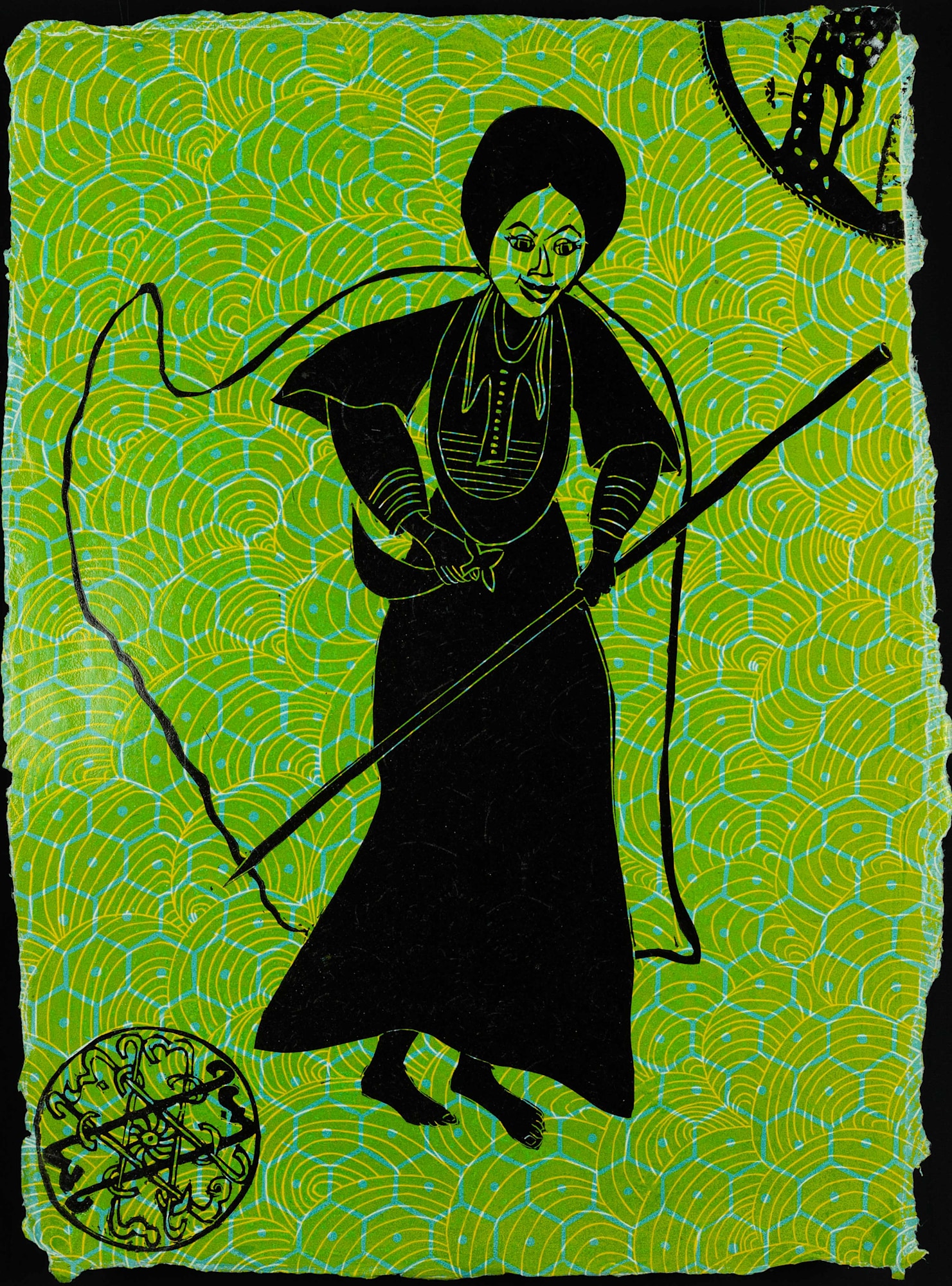 In this second iteration, femmes untethered thaw from their frozen stances. The eighteen, now, fully frontal femmes armed with WMD—rolling pins, knives, swords, a German Lugar, rulers, spoons, spears, wine glasses, fire and blow torches—arise patterned and bejeweled. Conjured from the wakes in the ocean, the primordial expanse and the galactic star formations, they emerge unbound with the right to narrate their own stories. They array into an untethered ancient talismanic formation and in some instances surrounded with a geometric pattern and/or a recurring map of the world from the 12th Century. Named and free from service to the Sultan, they materialize from the fertile firmament. Adorned with words, patterns and shapes that confer magical blessings, they rejoice in radically boundless ways. Invoked into the past, their bright futures are guaranteed to sparkle.