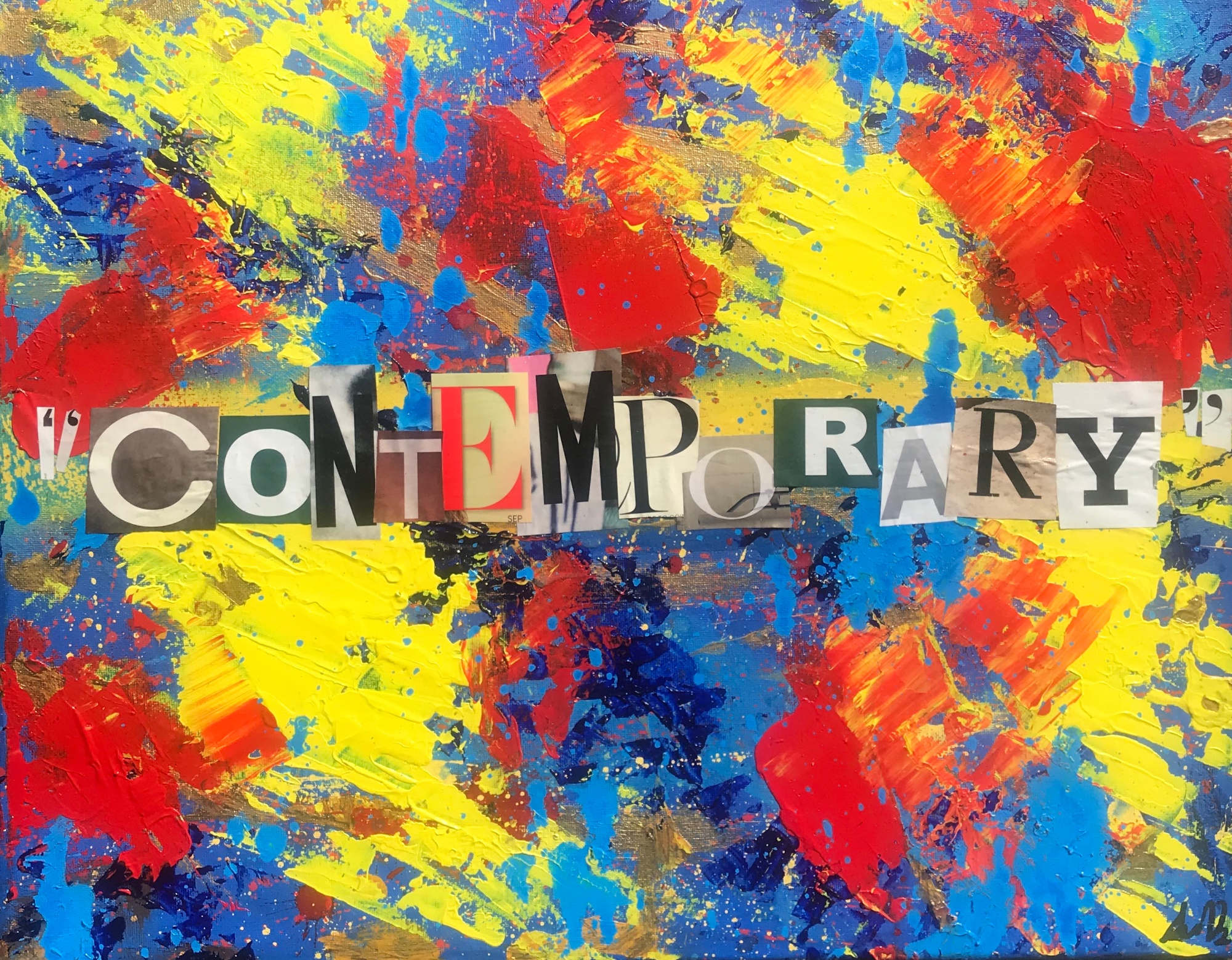 Another take on the primary color palette, “CONTEMPORARY” knows what it’s all about. Dark blue, yellow, and red acrylic applied with a palette knife add texture and depth to the blue base. Gold hints add a reflective element, while elevating the overall piece. “CONTEMPORARY” is spelled in cut and pasted letters across the middle.
