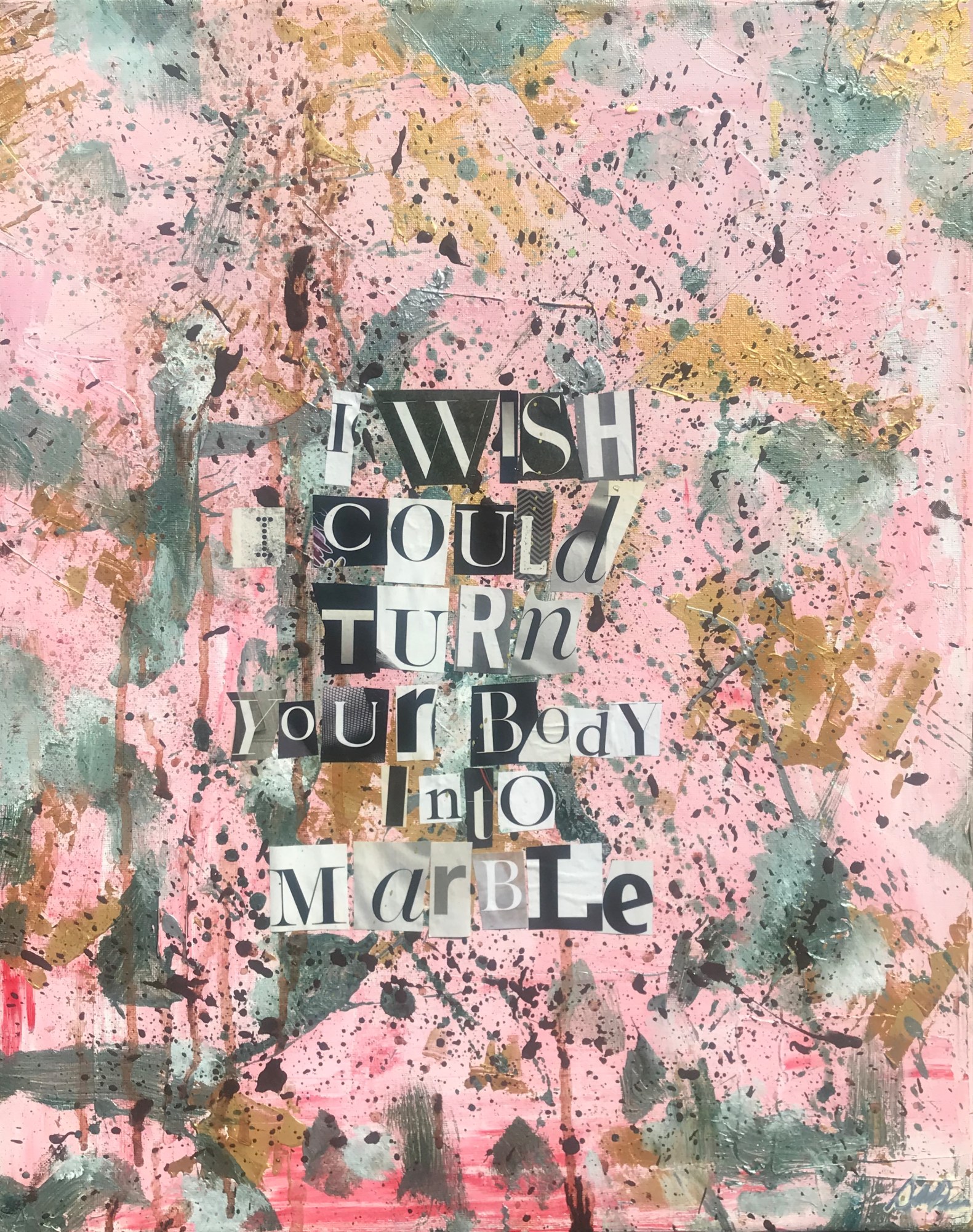 “MARBLE” is reminiscent of pink salt. The background of pale pink creates a marble effect, furthered by the jade green mixed with white and smeared around the piece. Gold elevates the mood, while splatters of dark bordeaux age the piece like a fine wine. Black and white letters spell “I wish I could turn your body into marble”, subtly alluding to Medusa’s ability to turn men to stone.