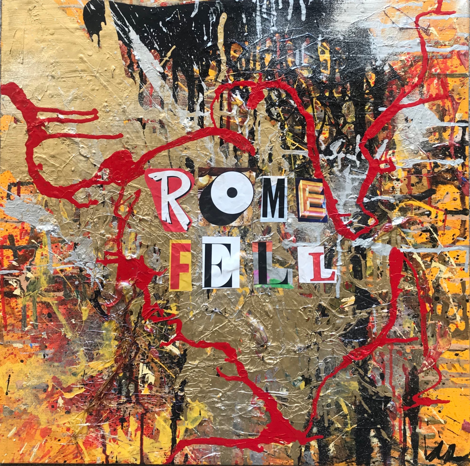 Grandiose and everything bold. "ROME FELL" before anyone knew what was happening. Even things of beauty and strength eventually fall. A sunset orange base gives way to dramatic black smears and drips down from the center-top, layers of red and brown and gold and yellow acrylic blend seamlessly in micro-grids throughout the canvas. Silver spray paint adds an airbrush effect; wiry texture raises in the form of tinsel in a tangle with all the paint. Thick acrylic gives way to dimension, much of which reflects in the gold oil spill puddle starting in the top left. What is left behind from an empire is a network of destruction; a blueprint for something beautiful. Red lines climb around, following the intersections of the grid gone before. "ROME FELL", and naturally gave way to something new.