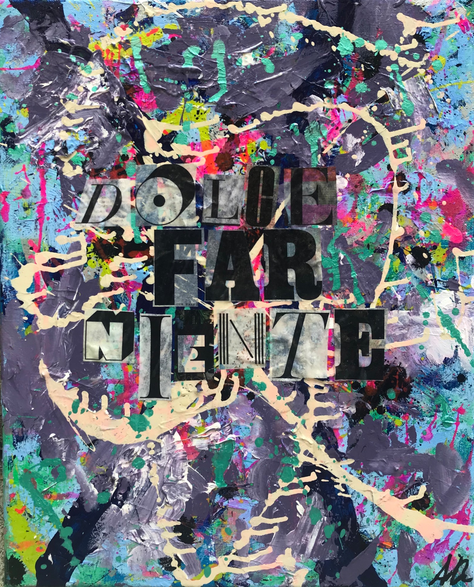 An array of hues, from metallic teal to sky blue to hot pink to white. “Sweet Idleness” is everything but idle; except that it is a moment frozen in time. A background of baby blue is speckled with hints of navy and lime green. Smears of purple-gray pass for clouds; cream ink slashes the canvas, capturing movement; drops of teal splatter across the top layer. Bursts of hot pink peeking out from behind other colors seriously makes the canvas pop. “Sweet Idleness”, the translation of the Italian phrase dolce far niente, ties the piece together with black and white offset text.