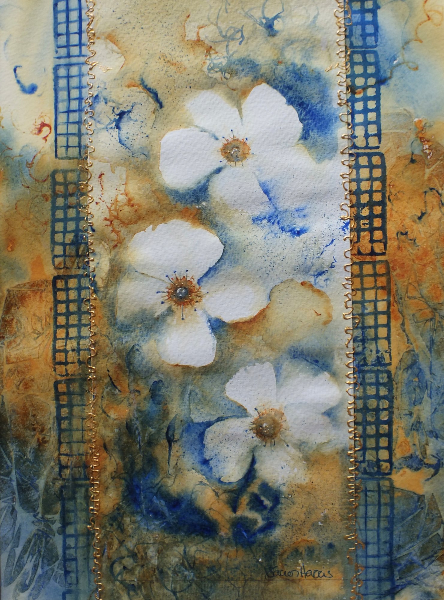 A simplified palette helps show the brushwork and design elements of this collaged watercolour piece. The gold cerne relief entwining the trellis adds a little extra texture and dimension.