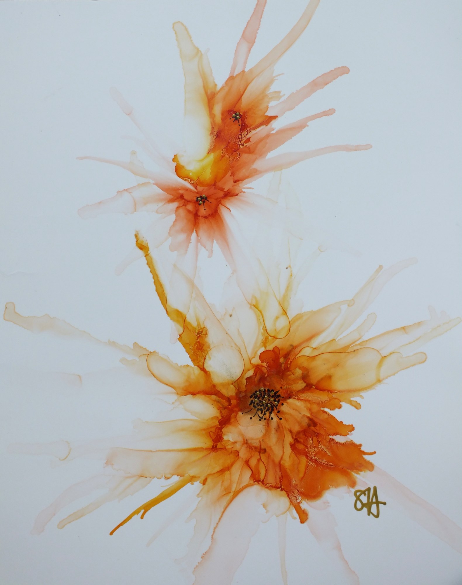 A bright abstract flower painting in alcohol ink using air blown application with gold accents