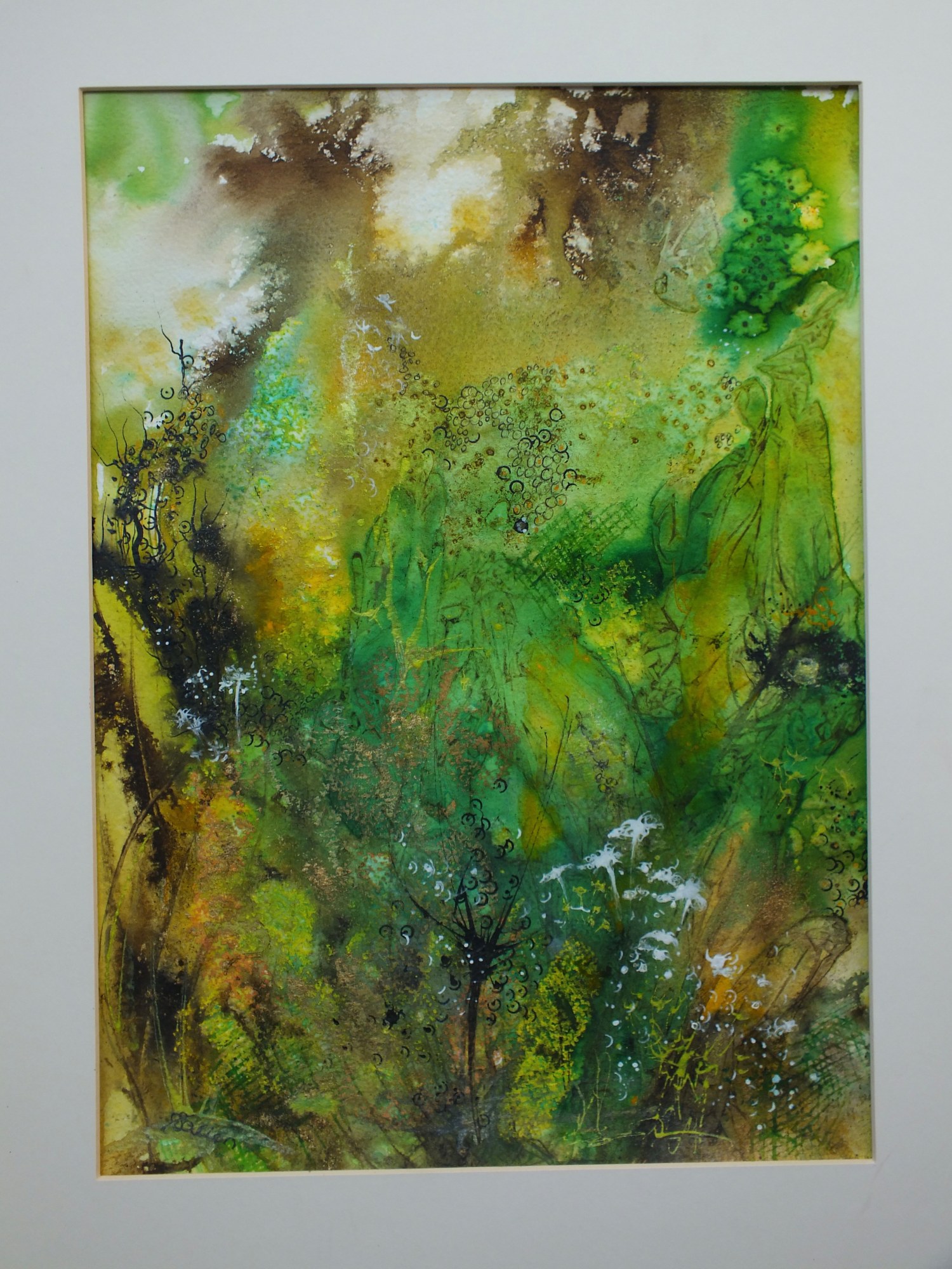 A vibrant watercolour and acrylic ink abstract with multiple mark making techniques to create a forest like feel to the painting.