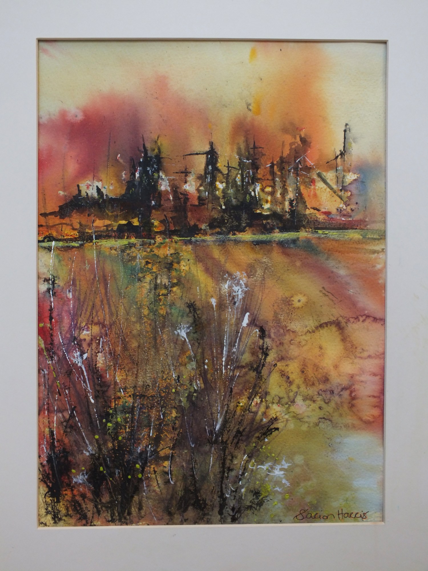 Dramatic wasteland view to the docks created by watercolour, ink and pearlescent acrylic inks and a little gold shimmer dust