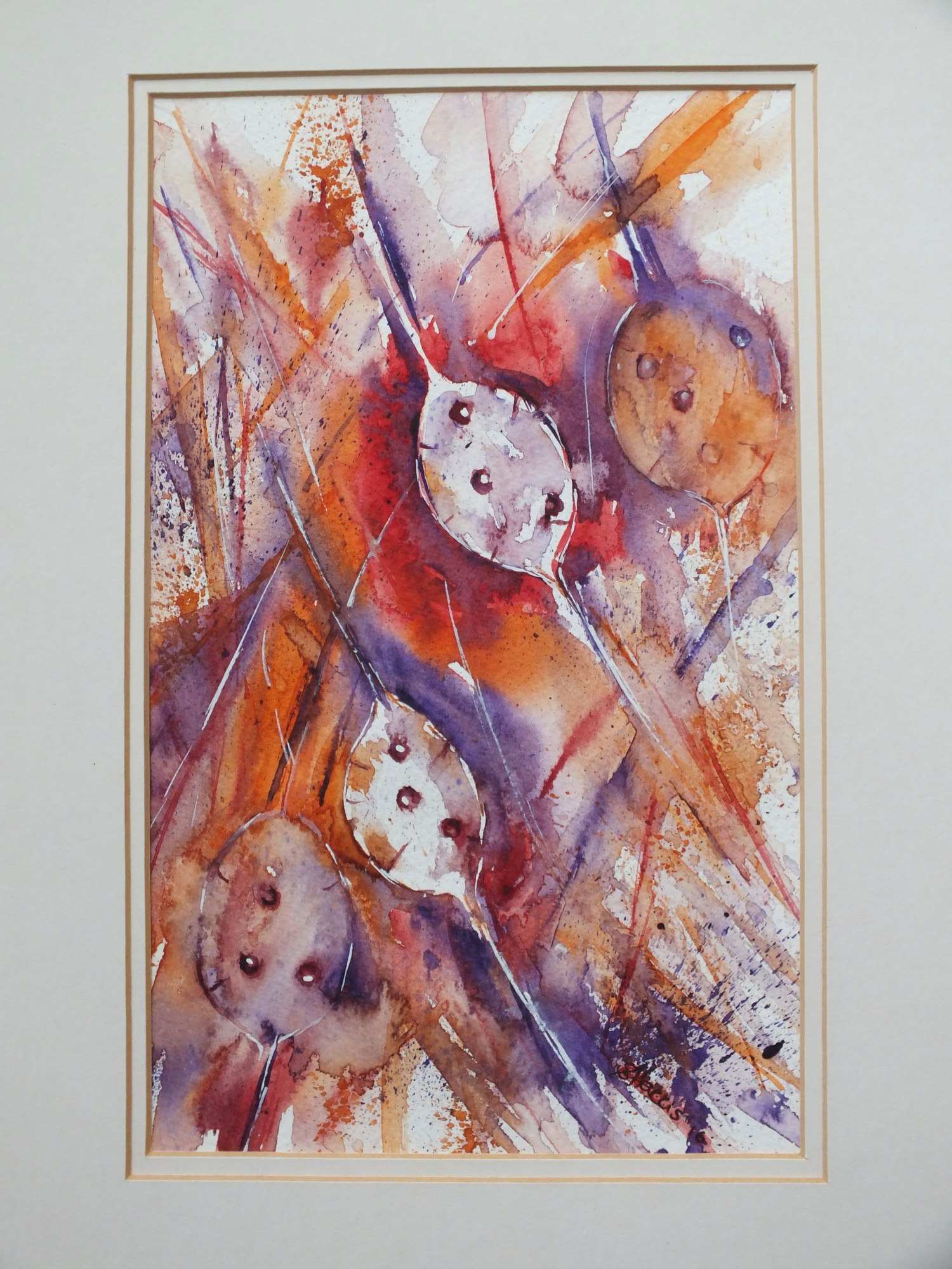 Strong colour choices have created a vibrant abstract watercolour painting of honesty seedheads.