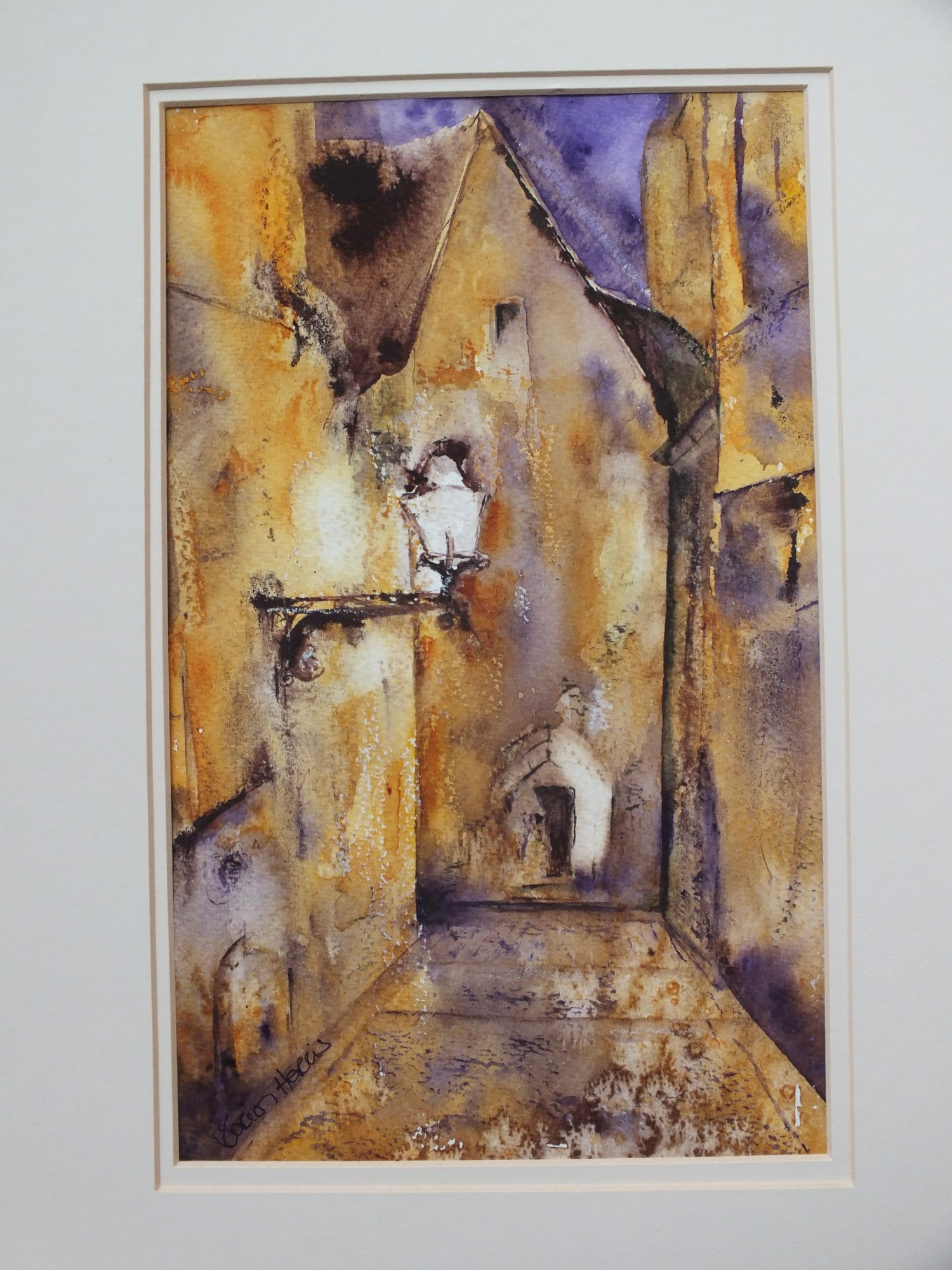 An atmospheric painting created with windsor violet and quinacridone gold watercolour applied in a loose and impressionistic manner