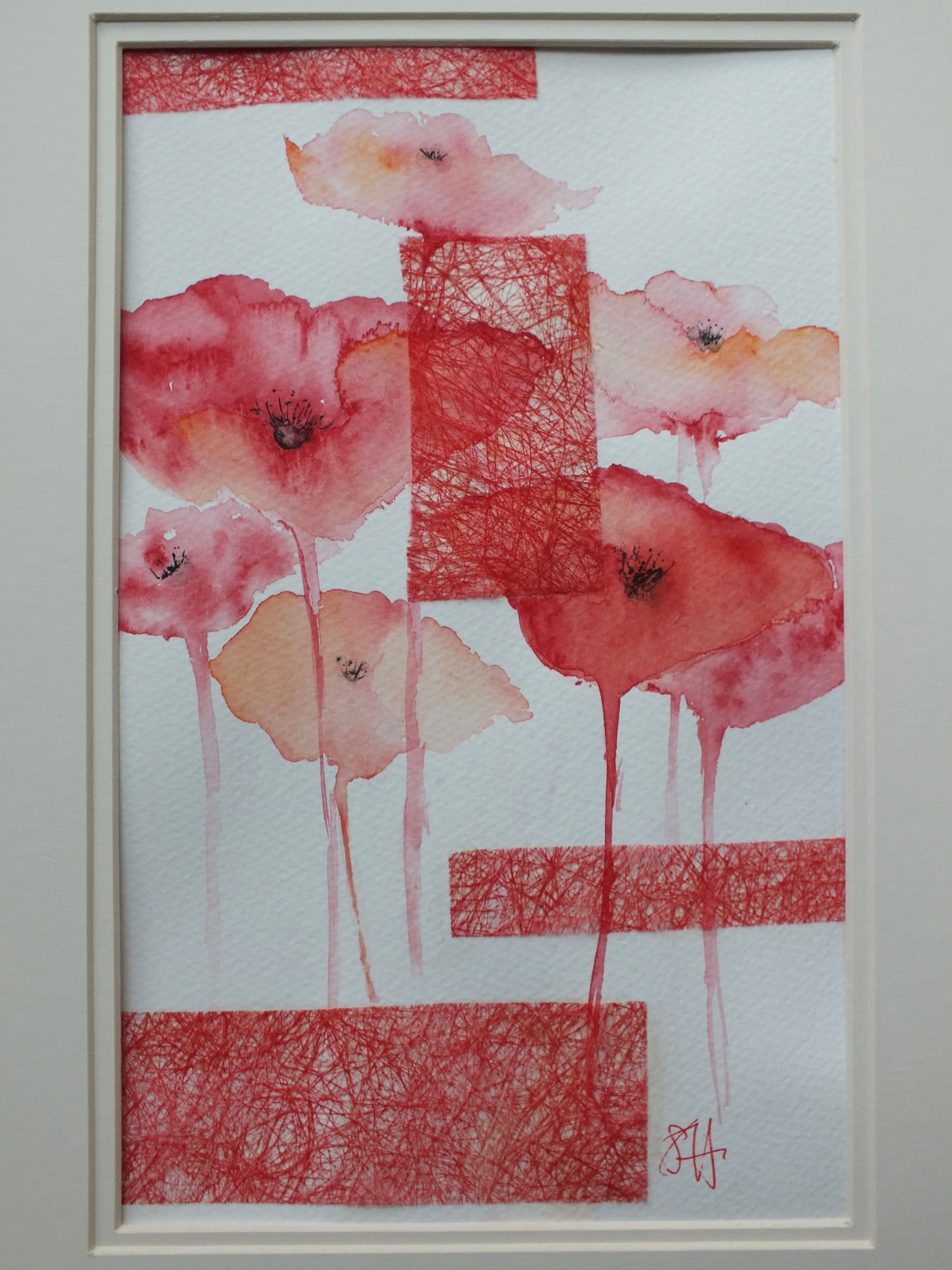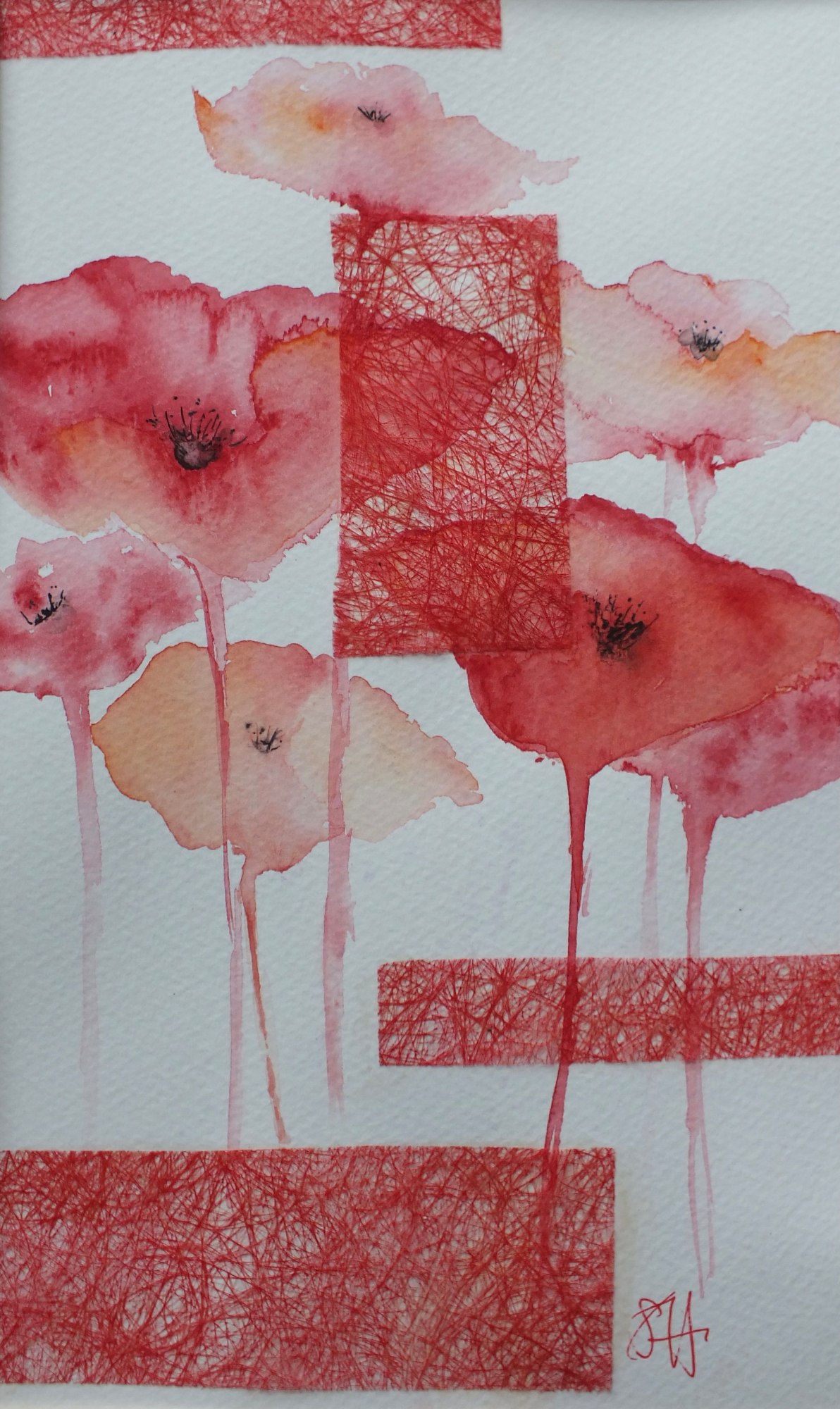 A contrast of delicate poppies in watercolour enhanced by collaged handmade paper accents to create an abstract painting