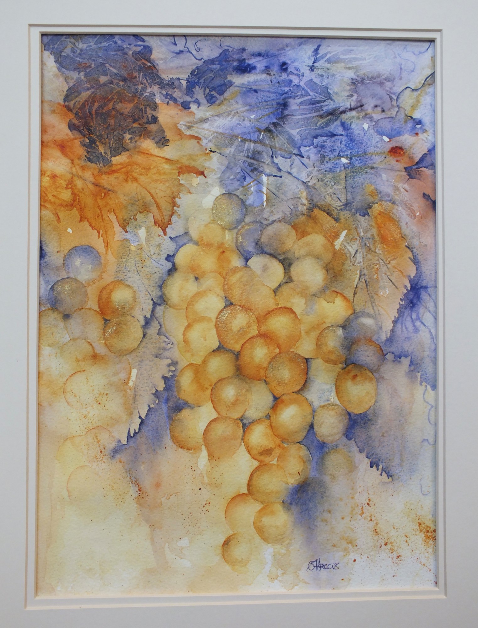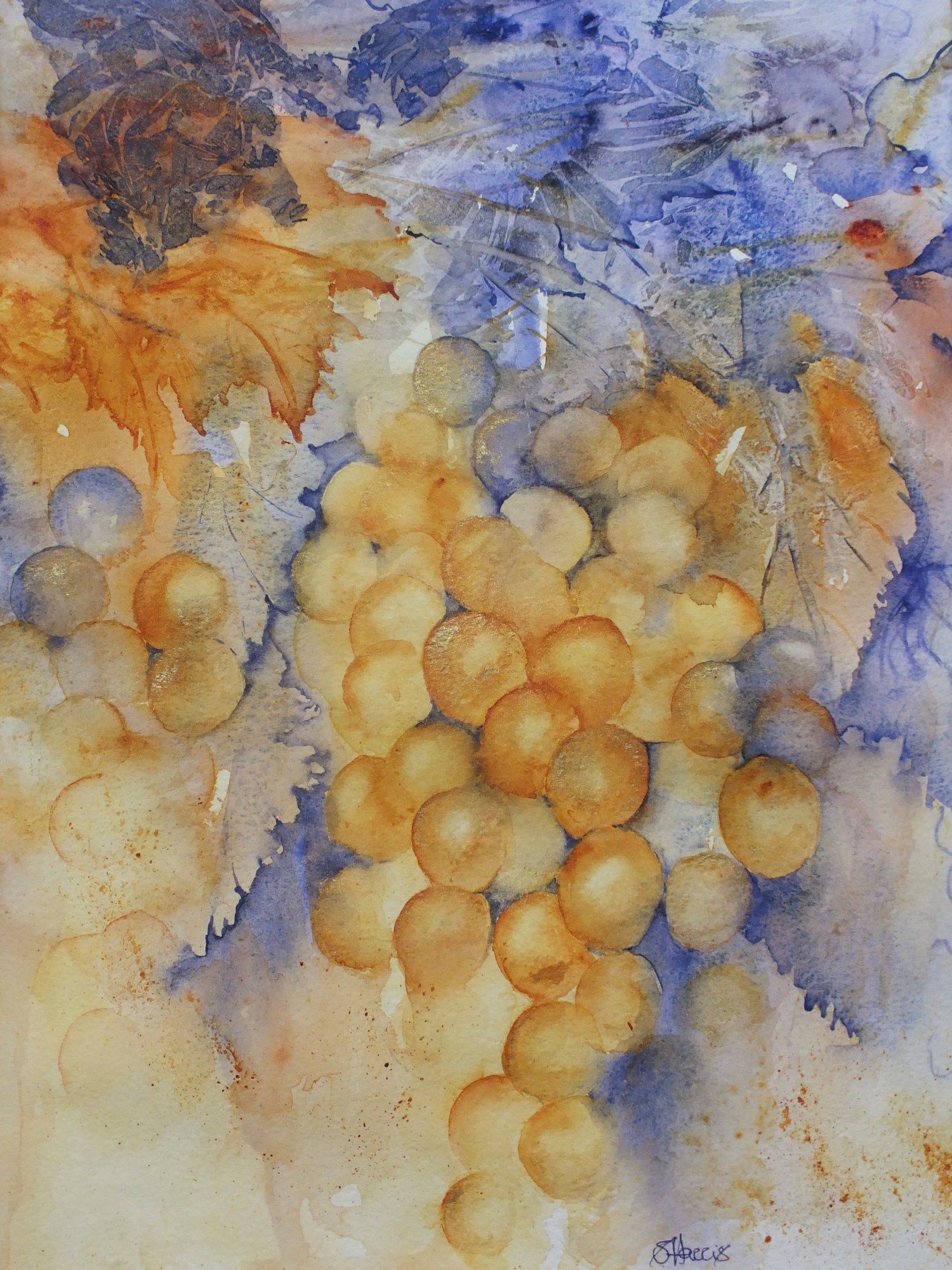 Sun kissed cognac grapes ripening in the Charente sunshine……a still life watercolour original with gold dust accents
