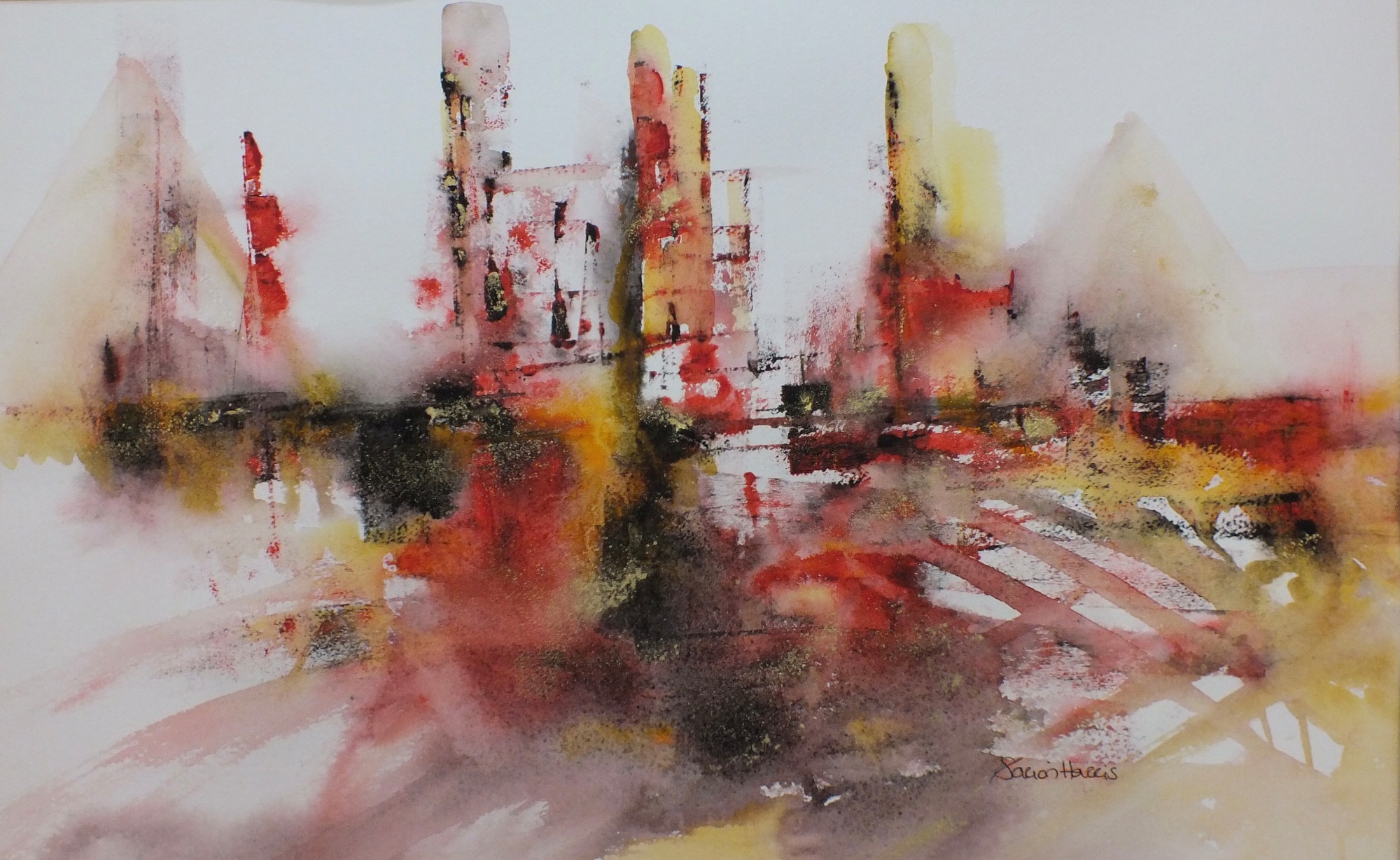 An eye catching abstract watercolour and acrylic ink painting….the gold dust accents make the quayside shimmer and bring the scene to life