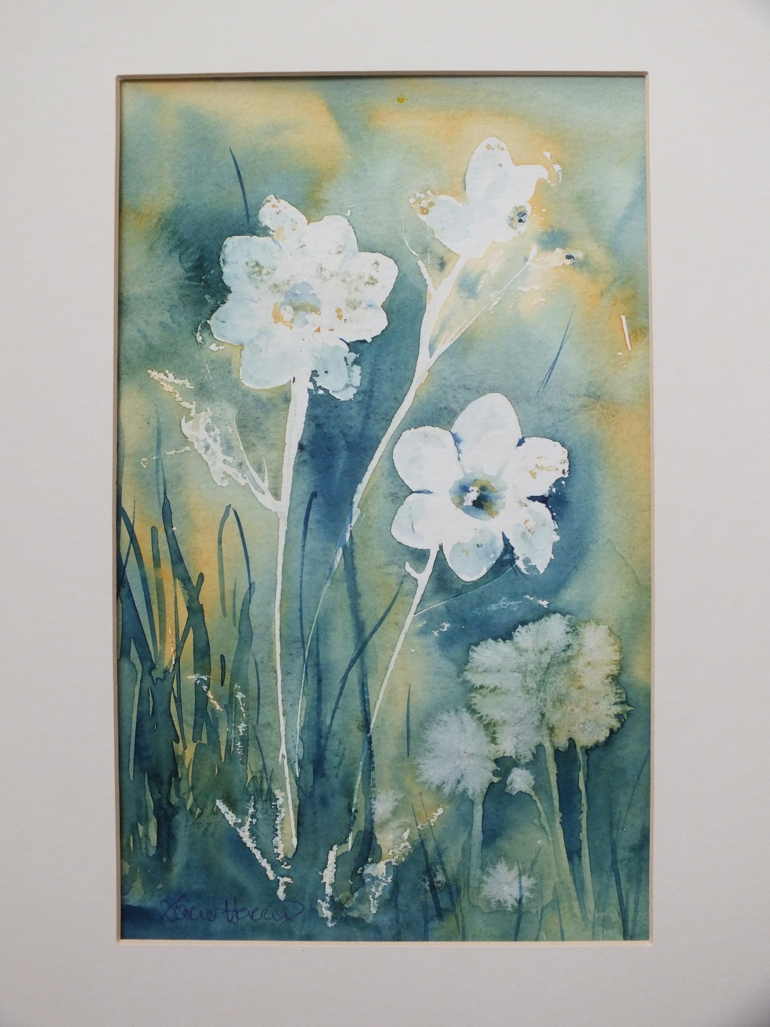 Just two colours - Quinacridone Gold and Prussian Blue make an atmospheric contemporary study of garden flowers
