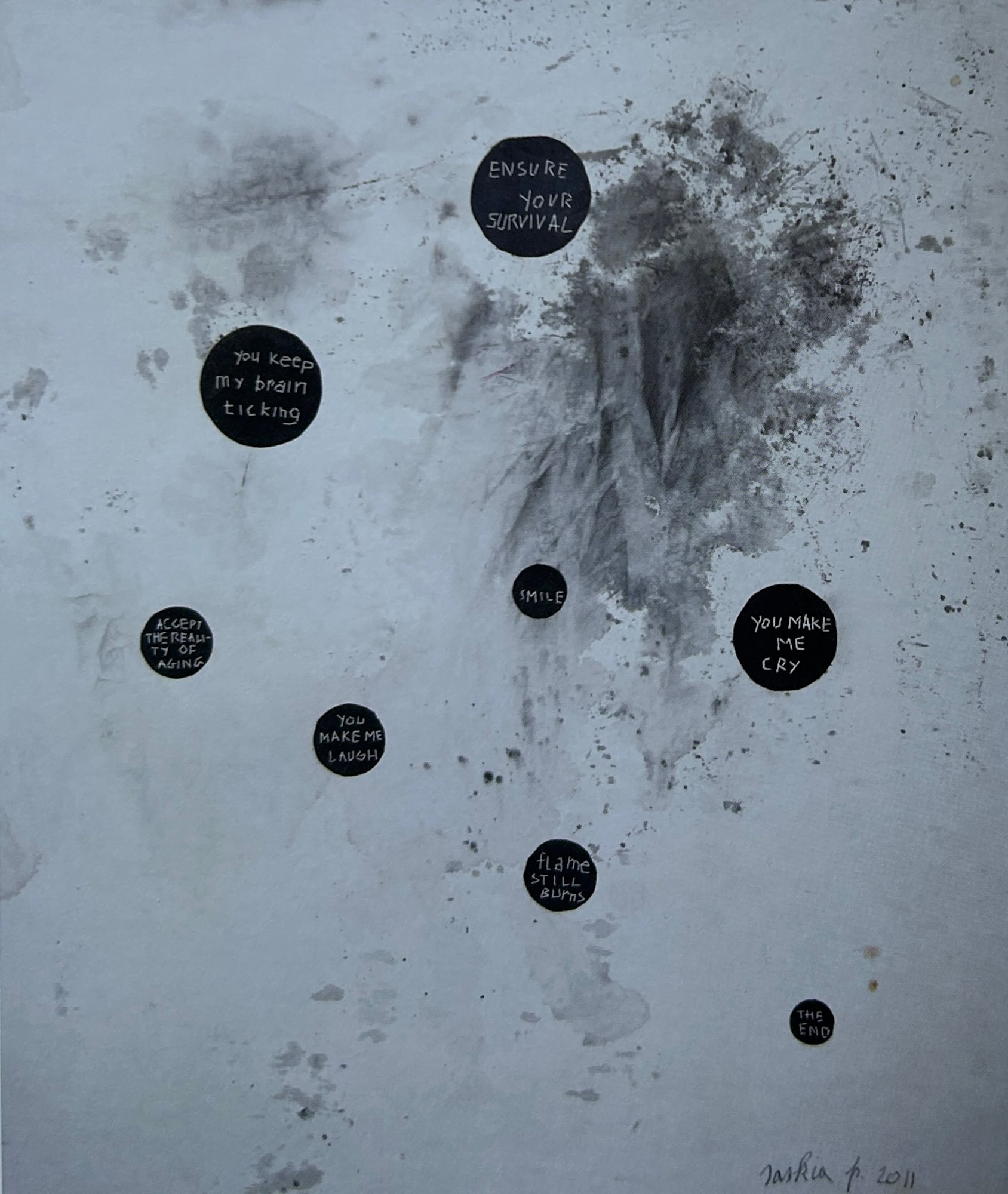 Belgium-born Saskia Pintelon moved to Sri Lanka in 1982. Inspired by local and universal issues, stories from the gut and the heart, politics, and day-to-day concerns, her body of works interprets the collective human experience, environment, and the cycle of life with intimate and personal preoccupations. Saskia Pintelon is at heart a figurative painter who periodically verges towards abstraction and text-based work. The abstract canvases began as monochrome, some titled Spaces for Thought, later evolving into Mindscapes; a series of works with an abundance of color that the artist describes as selfies of the mind in its synoptic chaos. Physiognomy fascinates the artist and in the past translated itself into a series of large works, monochrome on recycled tea packaging bags, inspired by marriage proposals in the newspapers of Sri Lanka. Her 2016 series titled I AM ME consists of works from two series, small mixed-media collages and large mixed-media collages. Both are part of an ongoing project whereby the artist revisits her own work in the published, printed accordion-style book The Book of Faces whereby she customizes her own ‘Faces’ and turns them into ‘Other Faces’. The themes are some of her recurring ones related to age, beauty, gender, internet use, love, obsession with fitness, isolation, loneliness, and the balance between the public and the private us. Pintelon provides us a kaleidoscope of the physical and the emotional in her characteristic tongue-in-cheek approach as she subtracts, extracts, and adds to give us a glimpse into what makes us really human.