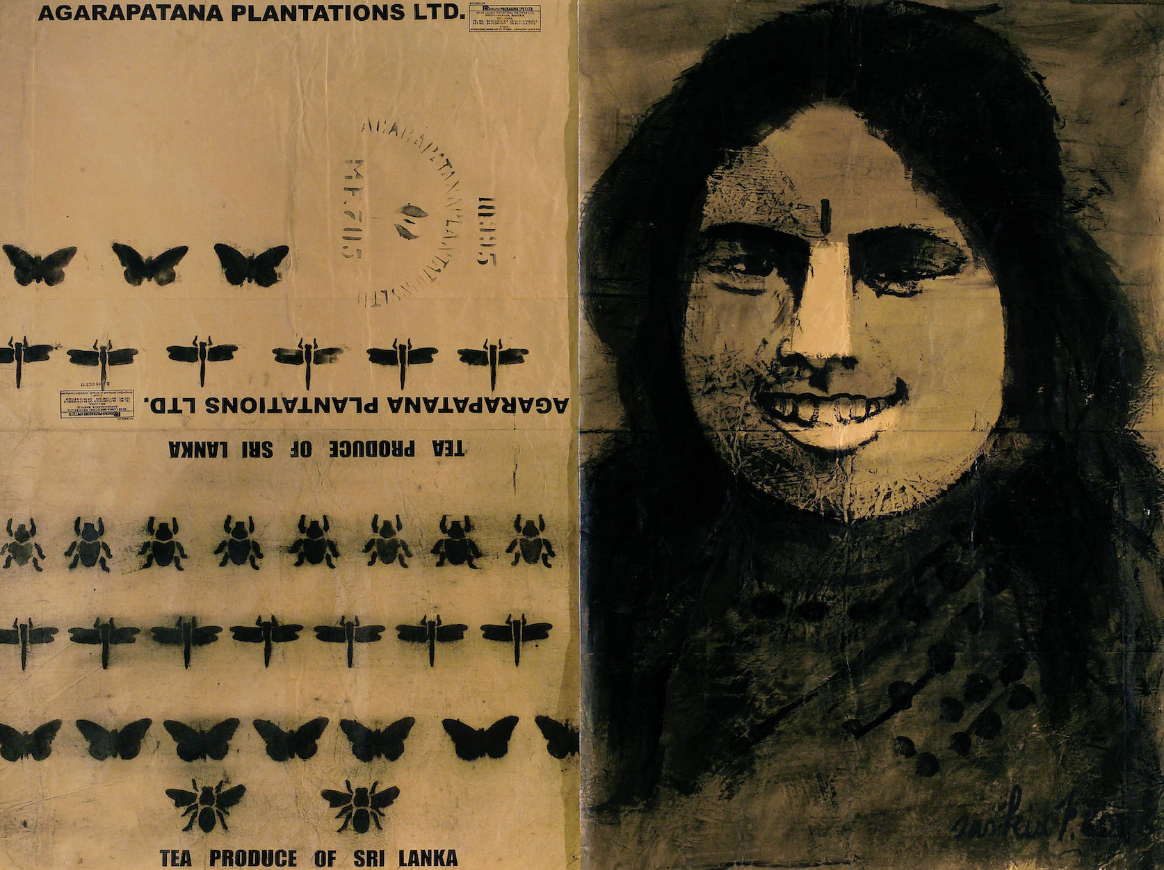 Belgium-born Saskia Pintelon moved to Sri Lanka in 1982. Inspired by local and universal issues, stories from the gut and the heart, politics, and day-to-day concerns, her body of works interprets the collective human experience, environment, and the cycle of life with intimate and personal preoccupations. Saskia Pintelon is at heart a figurative painter who periodically verges towards abstraction and text-based work. The abstract canvases began as monochrome, some titled Spaces for Thought, later evolving into Mindscapes; a series of works with an abundance of color that the artist describes as selfies of the mind in its synoptic chaos. Physiognomy fascinates the artist and in the past translated itself into a series of large works, monochrome on recycled tea packaging bags, inspired by marriage proposals in the newspapers of Sri Lanka. Her 2016 series titled I AM ME consists of works from two series, small mixed-media collages and large mixed-media collages. Both are part of an ongoing project whereby the artist revisits her own work in the published, printed accordion-style book The Book of Faces whereby she customizes her own ‘Faces’ and turns them into ‘Other Faces’. The themes are some of her recurring ones related to age, beauty, gender, internet use, love, obsession with fitness, isolation, loneliness, and the balance between the public and the private us. Pintelon provides us a kaleidoscope of the physical and the emotional in her characteristic tongue-in-cheek approach as she subtracts, extracts, and adds to give us a glimpse into what makes us really human.