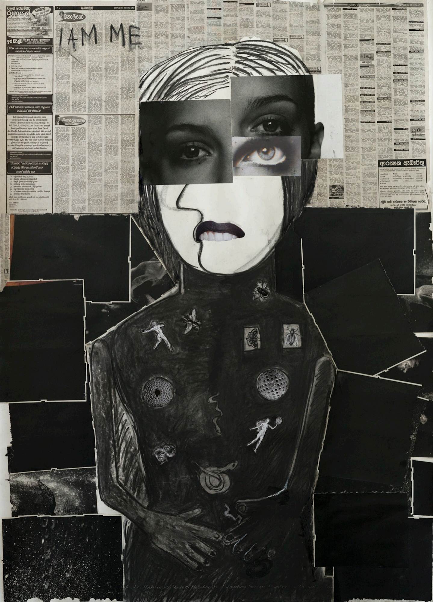 Belgium-born Saskia Pintelon moved to Sri Lanka in 1982. Inspired by local and universal issues, stories from the gut and the heart, politics, and day-to-day concerns, her body of works interprets the collective human experience, environment, and the cycle of life with intimate and personal preoccupations. Saskia Pintelon is at heart a figurative painter who periodically verges towards abstraction and text-based work. The abstract canvases began as monochrome, some titled Spaces for Thought, later evolving into Mindscapes; a series of works with an abundance of color that the artist describes as selfies of the mind in its synoptic chaos. Physiognomy fascinates the artist and in the past translated itself into a series of large works, monochrome on recycled tea packaging bags, inspired by marriage proposals in the newspapers of Sri Lanka. Her 2016 series titled I AM ME consists of works from two series, small mixed-media collages and large mixed-media collages. Both are part of an ongoing project whereby the artist revisits her own work in the published, printed accordion-style book The Book of Faces whereby she customizes her own ‘Faces’ and turns them into ‘Other Faces’. The themes are some of her recurring ones related to age, beauty, gender, internet use, love, obsession with fitness, isolation, loneliness, and the balance between the public and the private us. Pintelon provides us a kaleidoscope of the physical and the emotional in her characteristic tongue-in-cheek approach as she subtracts, extracts, and adds to give us a glimpse into what makes us really human.