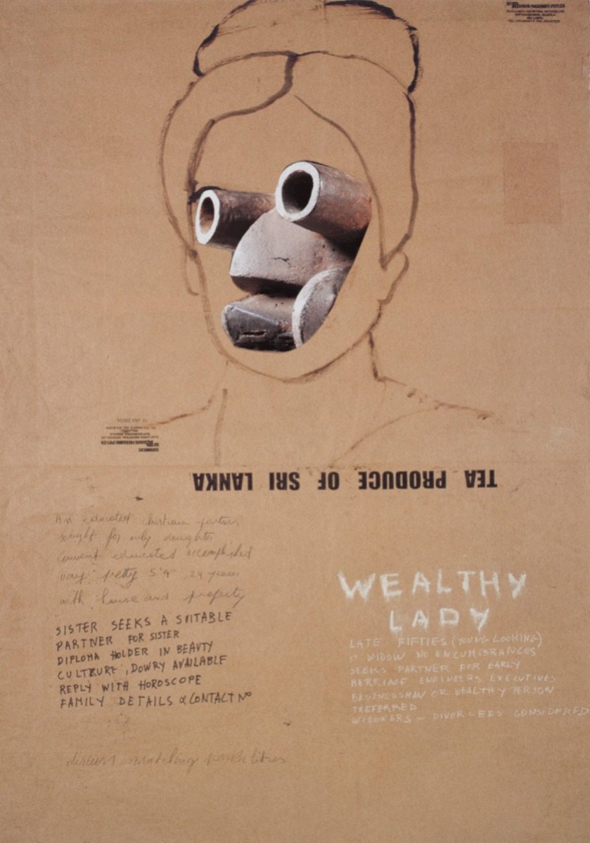 Belgium-born Saskia Pintelon moved to Sri Lanka in 1982. Inspired by local and universal issues, stories from the gut and the heart, politics, and day-to-day concerns, her body of works interprets the collective human experience, environment, and the cycle of life with intimate and personal preoccupations. Saskia Pintelon is at heart a figurative painter who periodically verges towards abstraction and text-based work. The abstract canvases began as monochrome, some titled Spaces for Thought, later evolving into Mindscapes; a series of works with an abundance of color that the artist describes as selfies of the mind in its synoptic chaos. Physiognomy fascinates the artist and in the past translated itself into a series of large works, monochrome on recycled tea packaging bags, inspired by marriage proposals in the newspapers of Sri Lanka. Her 2016 series titled I AM ME consists of works from two series, small mixed-media collages and large mixed-media collages. Both are part of an ongoing project whereby the artist revisits her own work in the published, printed accordion-style book The Book of Faces whereby she customizes her own ‘Faces’ and turns them into ‘Other Faces’. The themes are some of her recurring ones related to age, beauty, gender, internet use, love, obsession with fitness, isolation, loneliness, and the balance between the public and the private us. Pintelon provides us a kaleidoscope of the physical and the emotional in her characteristic tongue-in-cheek approach as she subtracts, extracts, and adds to give us a glimpse into what makes us really human.