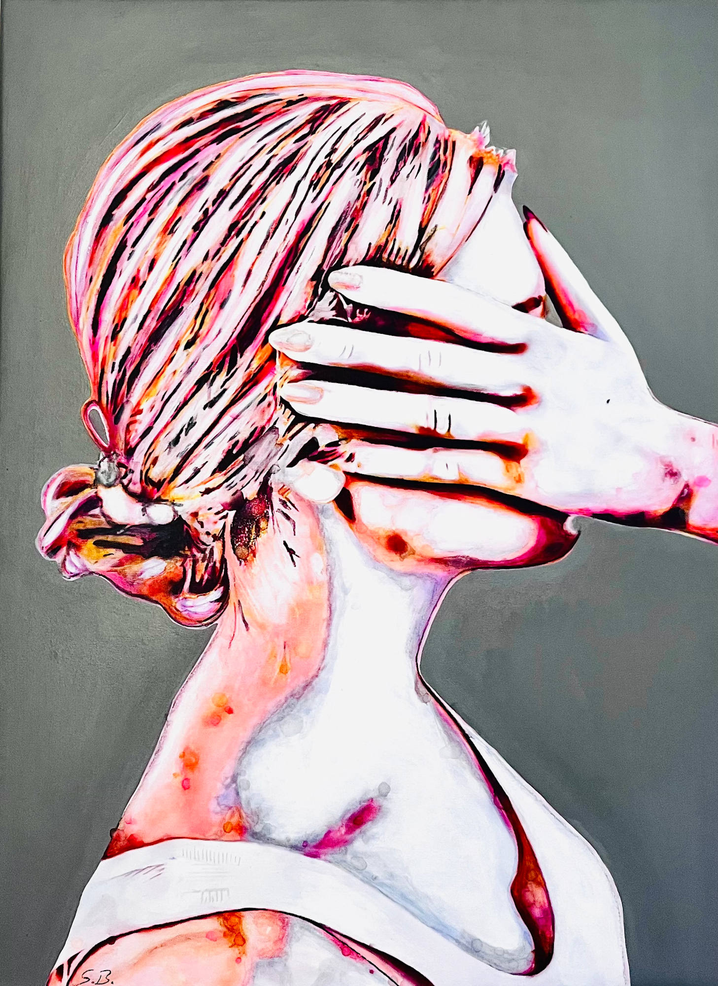 Das Porträt zeigt eine junge Frau, deren Augen von einer fremden Hand bedeckt werden und doch wirkt sie, als akzeptiere sie dies stillschweigend, ja fast zufrieden. Gerade in dieser scheinbaren Selbstverständlichkeit liegt die Ambivalenz: Im Spannungsfeld von Algorithmen und dem Zwang nach Bestätigung durch Likes und Follower stellt sich die Frage, ob Identität noch selbstbestimmt sichtbar bleibt oder längst bereitwillig den Blicken und Bewertungen anderer überlassen wird.