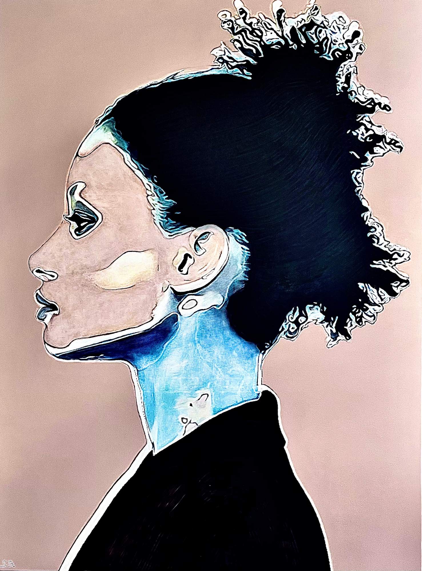 In dieser vierten Arbeit der Serie „MySpace“ setze ich mich mit der Grenze zwischen Mensch und digitaler Projektion auseinander. Ein seitliches Porträt verwandelt sich in eine Maske, vertraut und fremd zugleich.