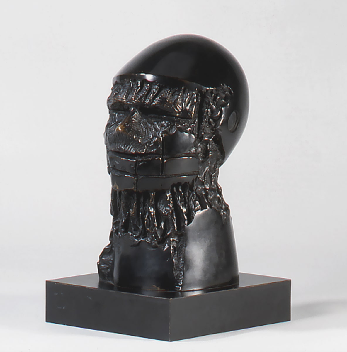 The “Technocratic Head” series represent my fascination with man’s integration with technology of the future. The dark patina, often in contrast to a polished helmet, represents man and machine. In conjunction with this, I wanted to create powerful and spiritual images with the strength of the historical Benin bronze heads of the culture of West Africans.