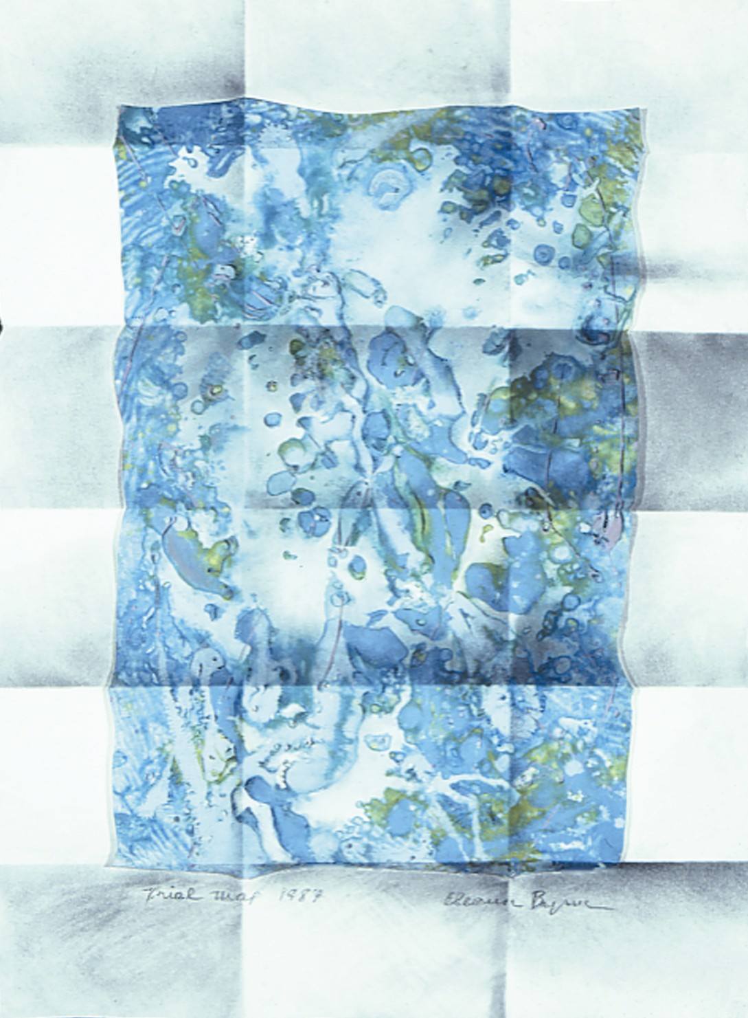 “Trial Maps” begin as imaginary planetary surfaces as yet unseen by the human eye. As I work, they begin to look more like maps of places where we have lived and hiked over the past forty years. The maps, or what is left of them, have been battered by years of wear, especially when they have fallen into the hands of hikers who, like me, have stuffed them back into their packs without re-folding them properly. The maps respond to this casual treatment by taking on a life of their own. Their folds grow in importance as they become progressively less believable. The surfaces begin as accidents, as they do in nature. Shapes (geographic, geological, human, animal, fantastic) emerge and are emphasized in intuitive ways. Maplike symbols appear to authenticate imaginary places. I play with the contrast between the real and the imagined, the known and the unknown.