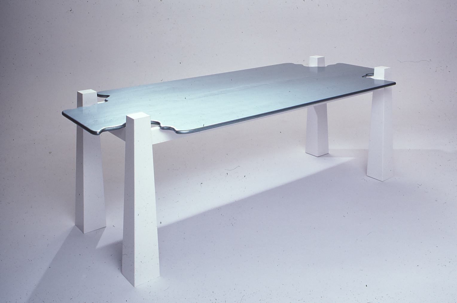 Water Table by Lewis utilizes custom painted finish to reproduce the qualities of the ocean on a hazy day on this table top. The form of the table itself is shaped like a body of water and the subtle humor and virtuosity of this work are both characteristic of contemporary art furniture.