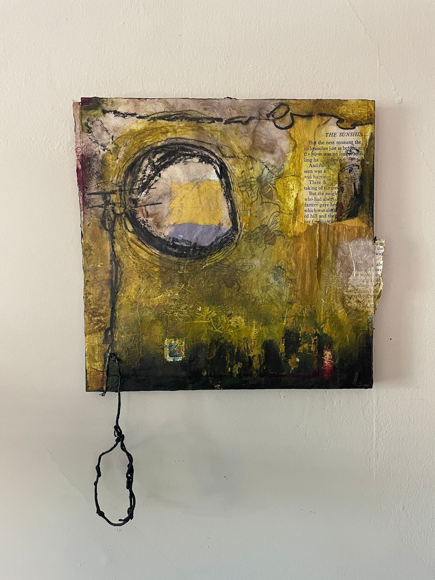 During an artist workshop in California’s Central Valley, this piece emerged as an exploration of time's transformative power. The surface tells a story of erosion and renewal through peeling layers and earthy tones of gold and rust. Bees, etched into the layers, offer a symbolic nod to patience and effort, their hive-building echoing the artistic process. Subtle traces of earlier layers and marks remain visible, revealing the evolving journey of the work, much like time leaves its mark on all things.