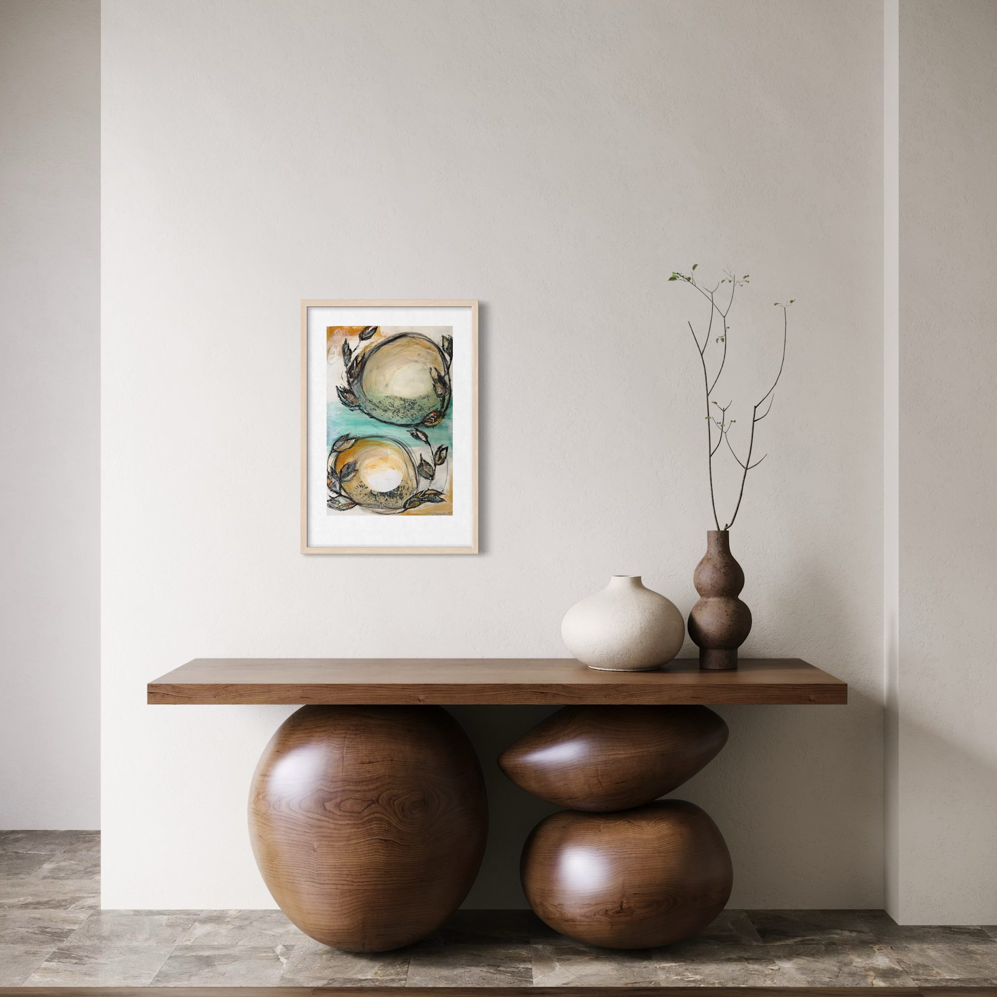 After those golden, mineral-like tones settled in, I built the composition with acrylic, charcoal, and chine-collé, shaping circular fields and seed-like forms that feel rooted in nature without pointing to anything literal. The collage textures, drifting lines, and soft color washes create a quiet sense of movement—forms slipping into focus, then relaxing back into abstraction. Familiar, but never fixed.