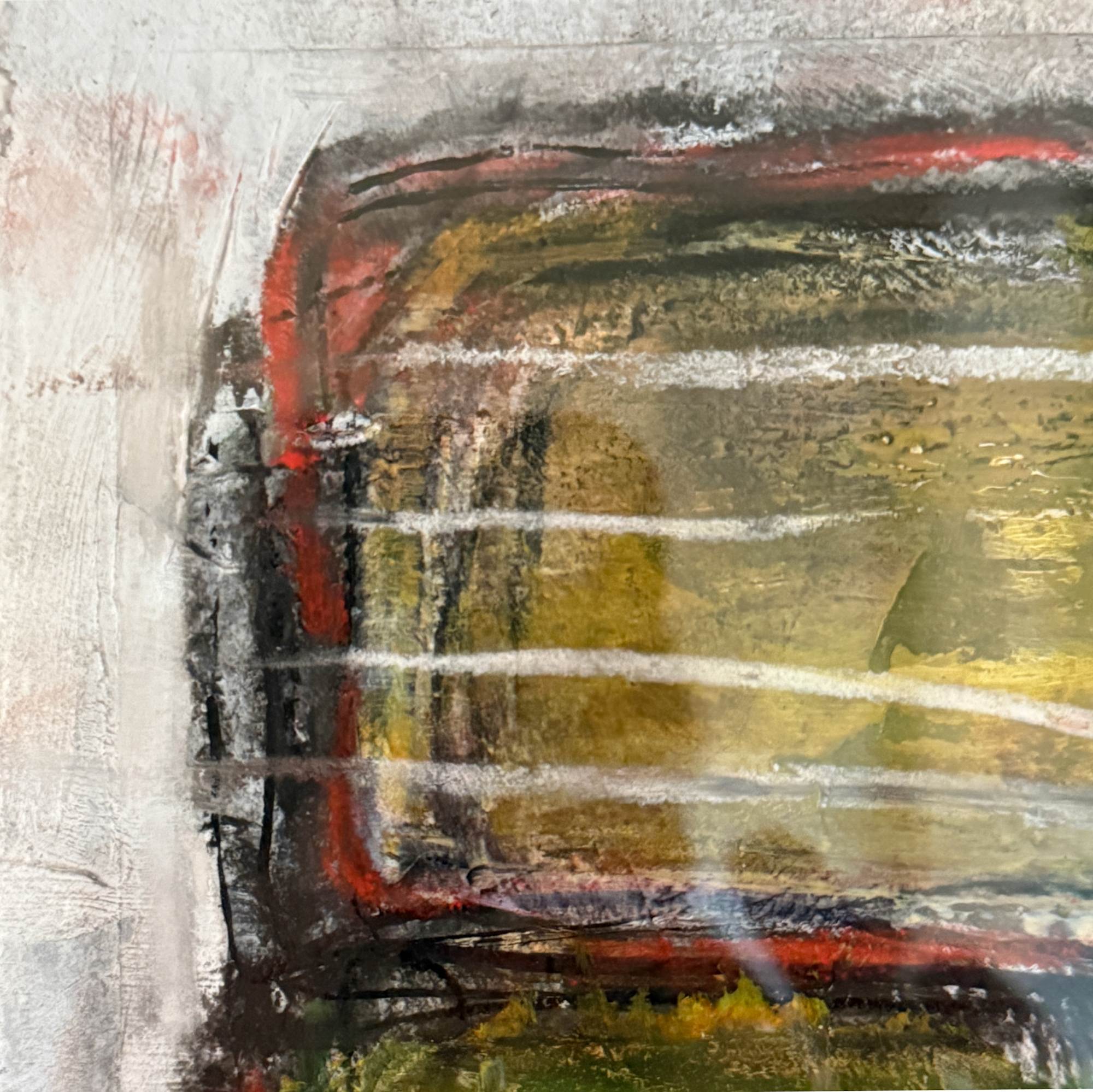 This work explores the dialogue between structure and erosion. Rectangular forms anchor the composition, while scraped textures and layered pigments break their boundaries. A ghostlike figure lingers within the surface, hinting at hidden histories and fragile presences.