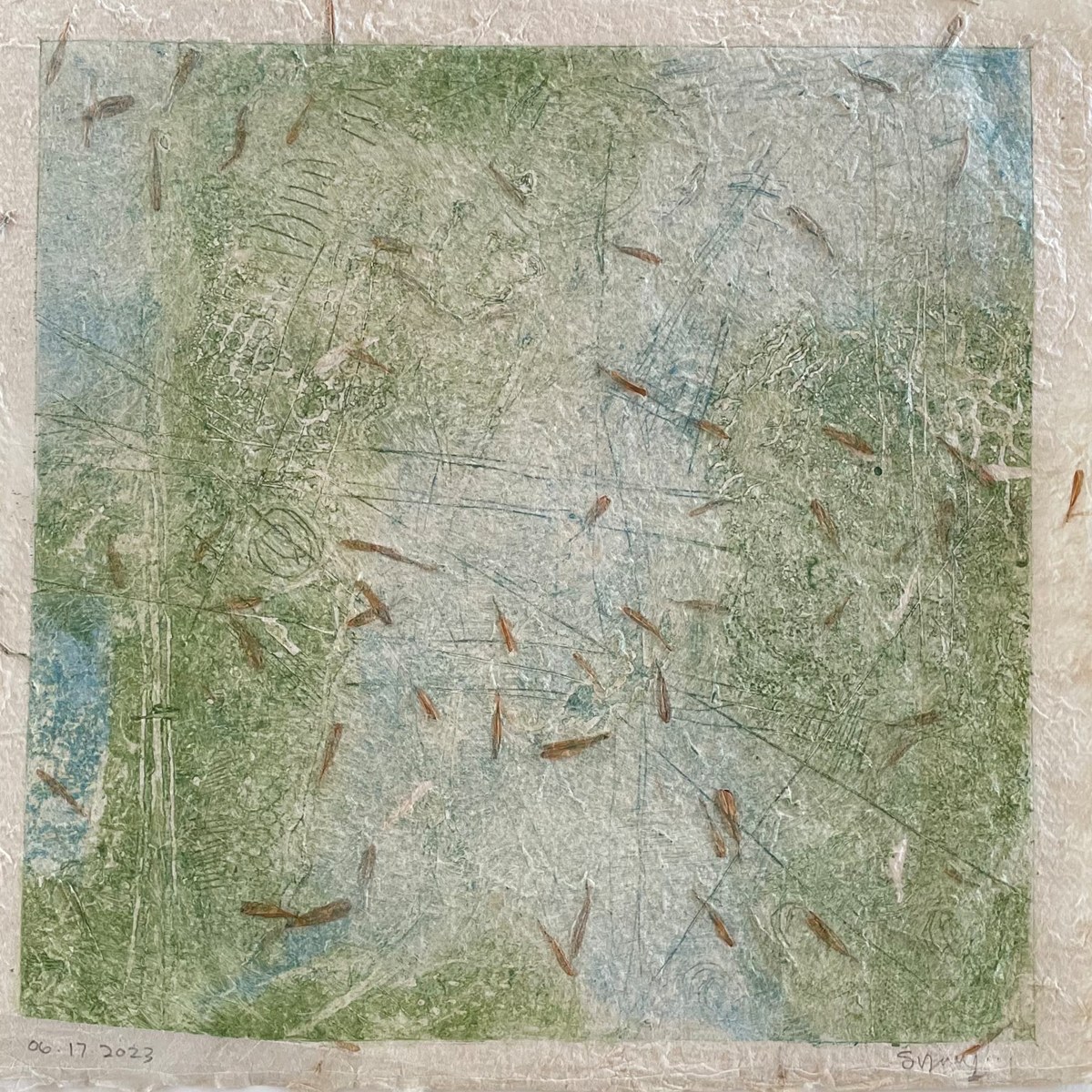 This encaustic etching collagraph showcases a captivating underwater world, brimming with life and wonder. Drawing inspiration from my extensive reading about fascinating sea creatures, particularly the fascinating "Krill," I like how the Krill come to life through a combination of etching on the plate and printed handmade paper.