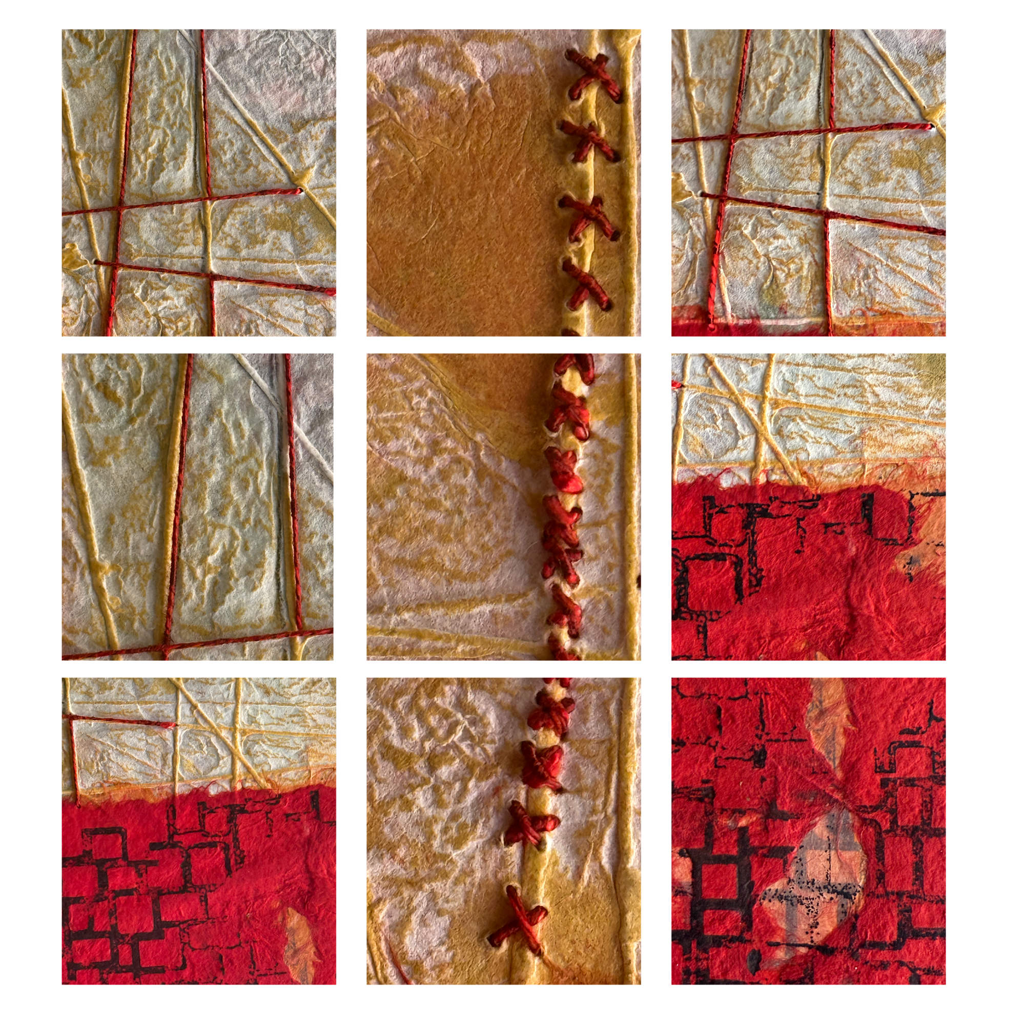 Etched into plexiglass, this drypoint composition evolved through repeated pulls using Japanese textured papers and a hand-powered pin press. Layer by layer, I explored the interplay of form and surface. The final piece was unfinished until I returned to it—embedding hand-drawn marks and stitching red thread directly into the tangled structure, giving the grid a quiet pulse.