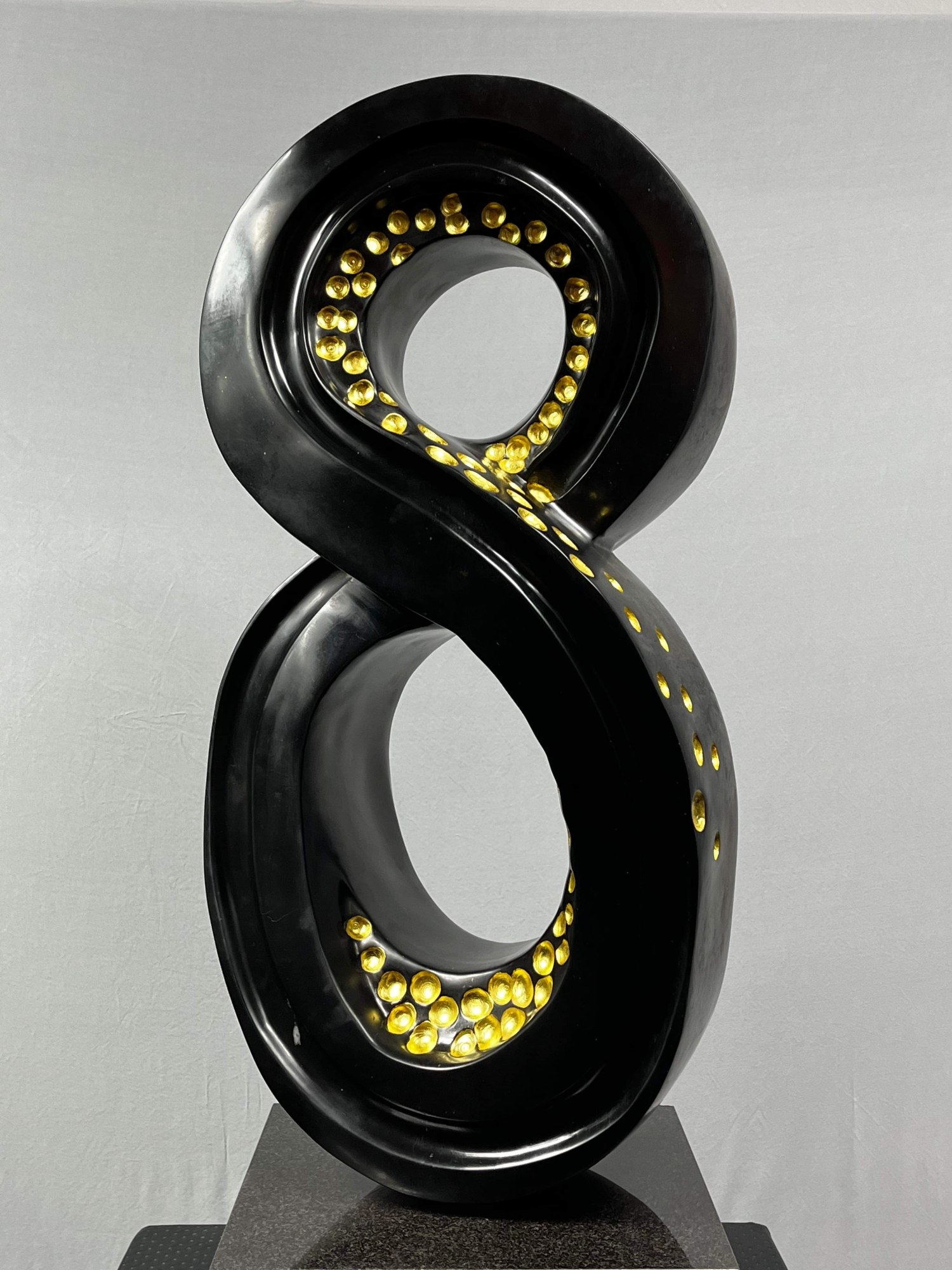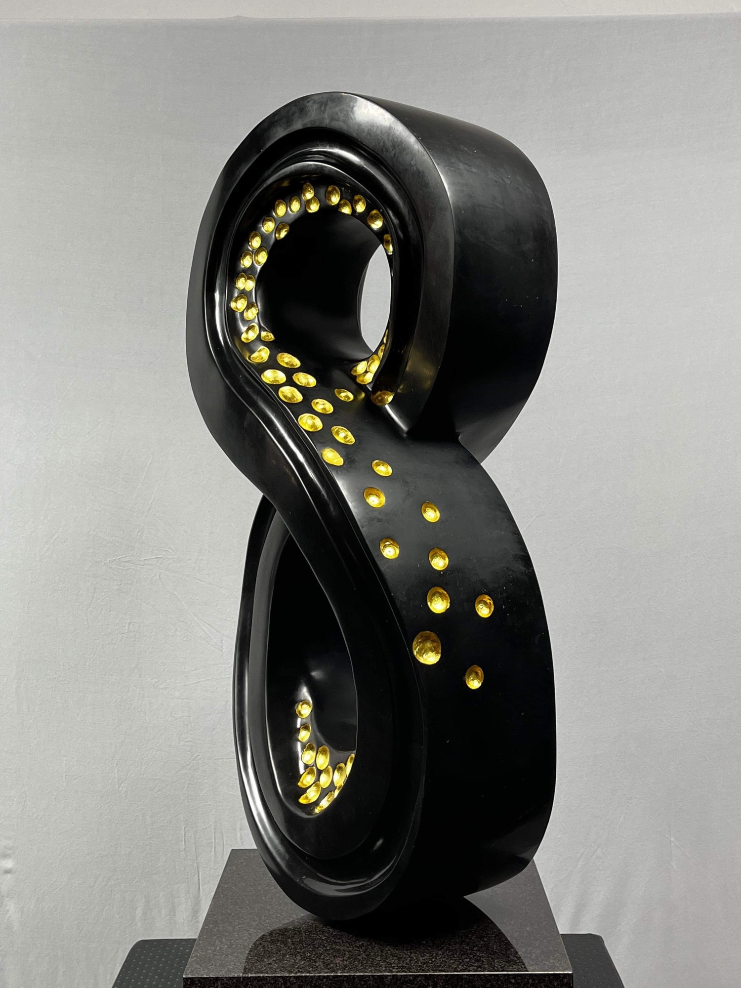 "Lucky 8" was carved from a solid piece of Atlantic black marble and embellished with over 90 perfectly placed divots that have been covered with 22K gold leaf to enhance the silhouette of the sculpture. It has been pinned atop a black granite base using an Italian, brass turning pin that allows for the sculpture to be turned 360 degrees on her base to appreciate the beauty of the sculpture from all angles.