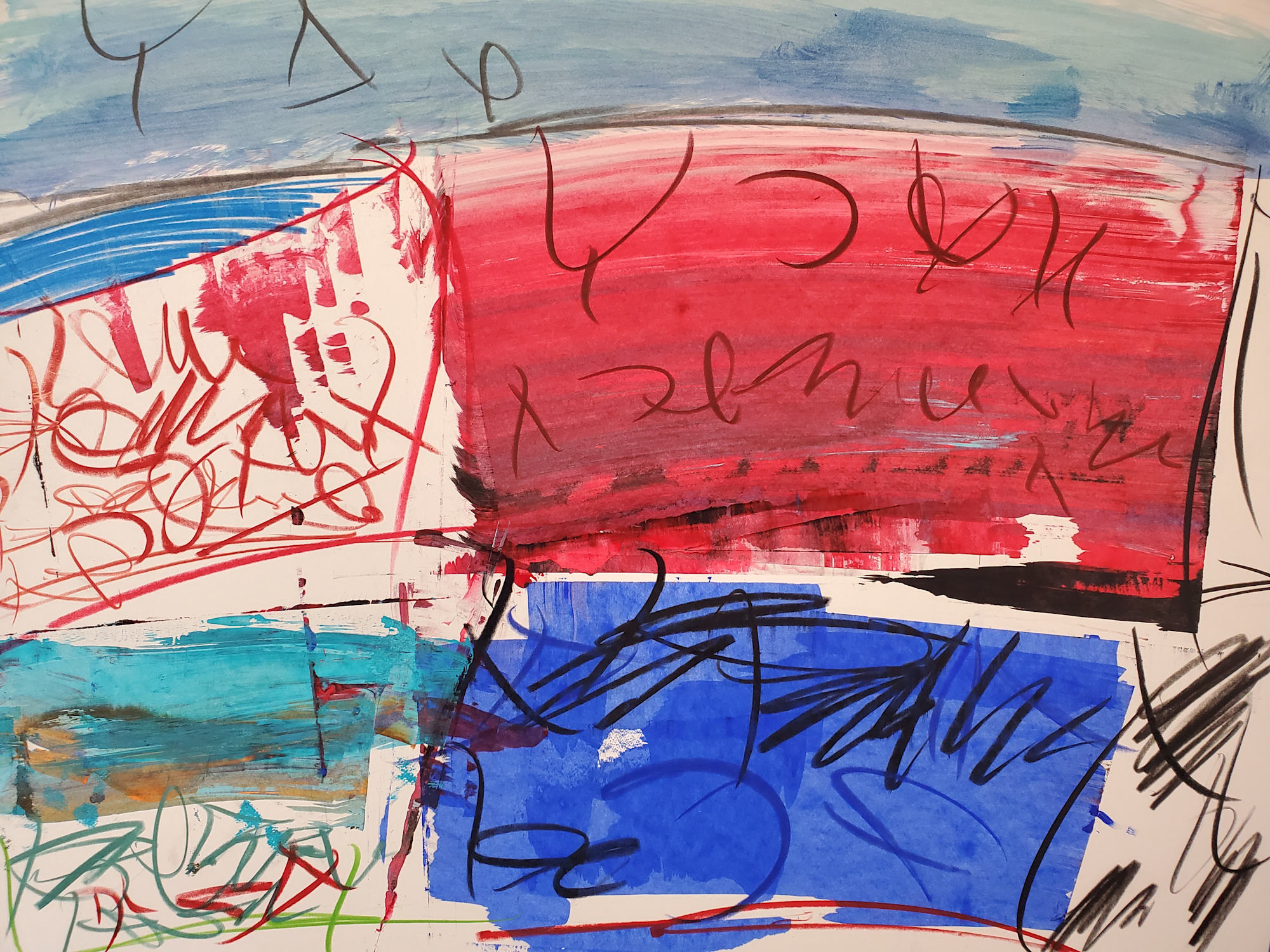 Red Field #5, 2-23-2025, 17.5" x 23", (44.45 x 58.42 cm), acrylic and mixed media on paper. Copyright Scott K. Adams, 2025.
