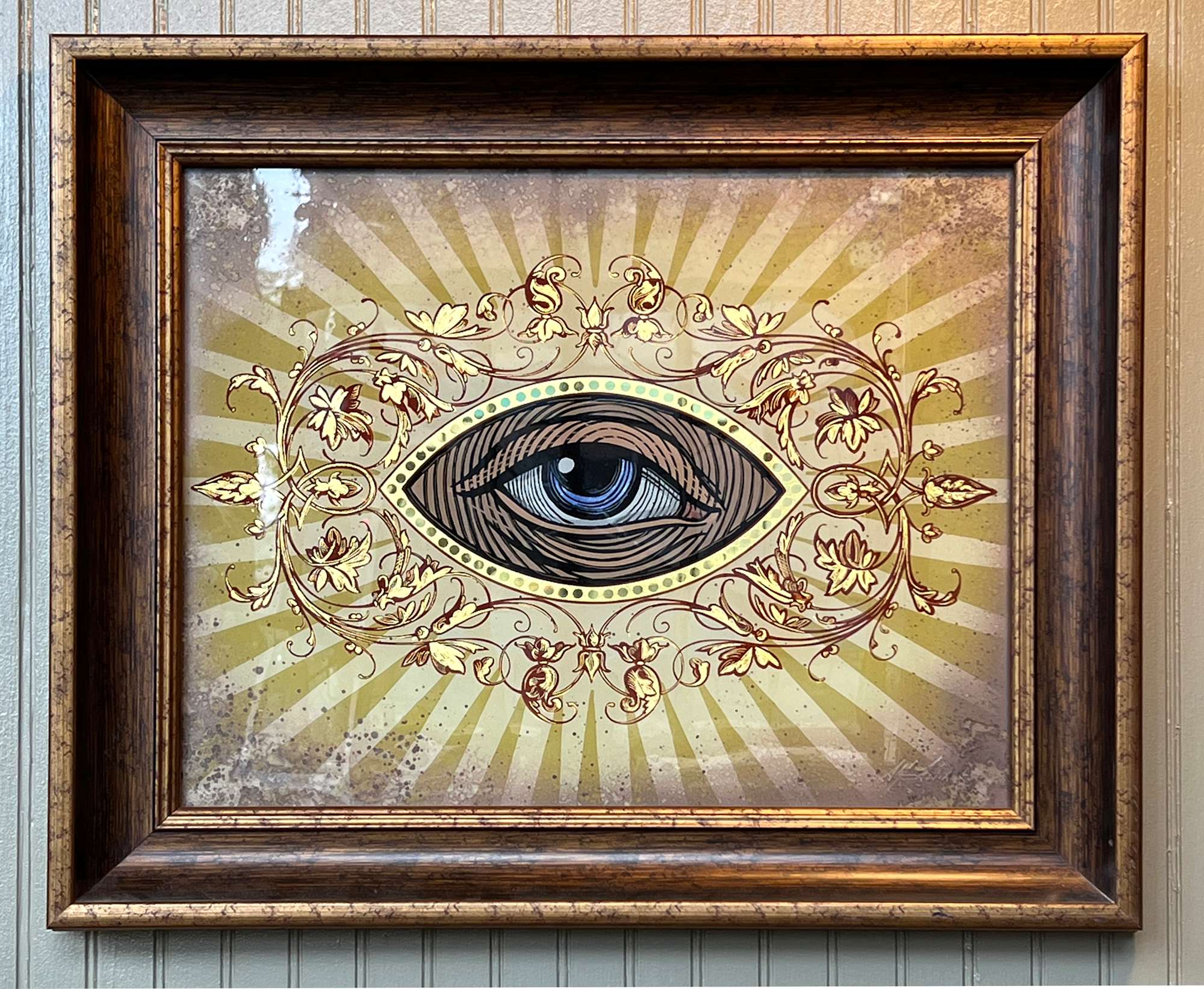 Verre Eglomise: reverse painted glass with 23k gold leaf.
