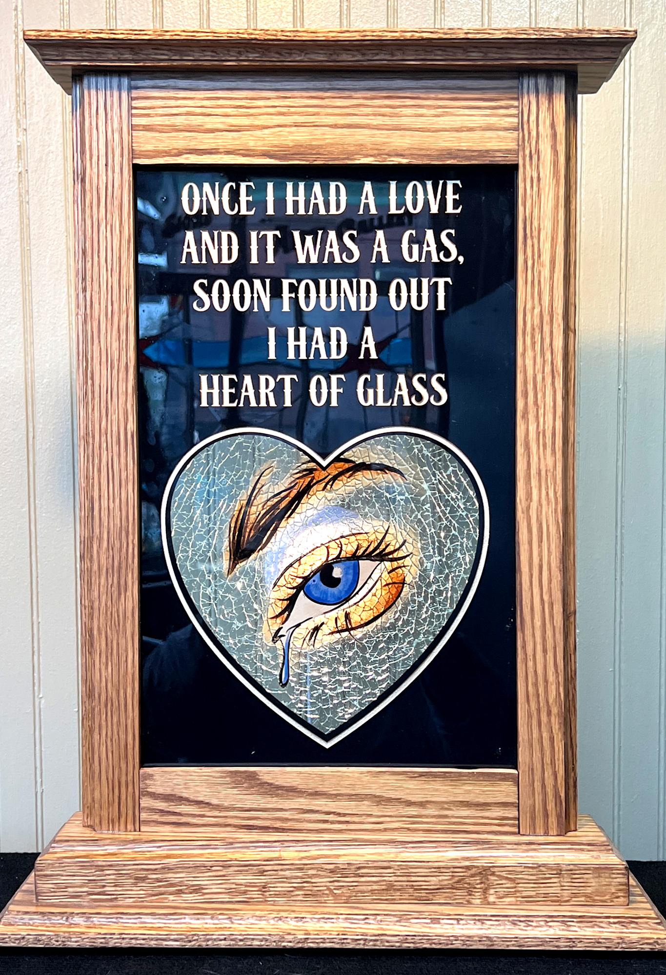 This piece is made up of 3 layers of laminated glass. The first layer is fire painted and blast carved. the second layer is shattered. And the third layer is a stabilizer. The standing frame is made of oak.