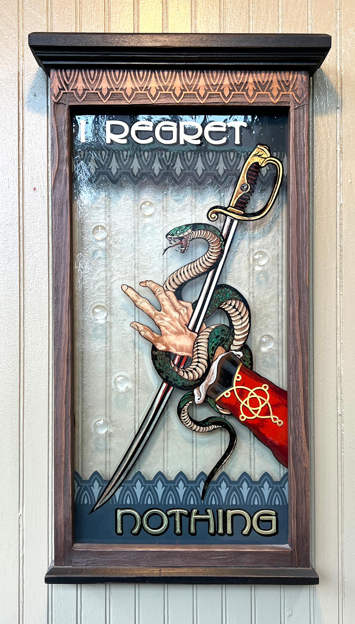 This piece is blast carved, glue chip textured, painted and gilded glass, with jewels, in a bespoke wood frame