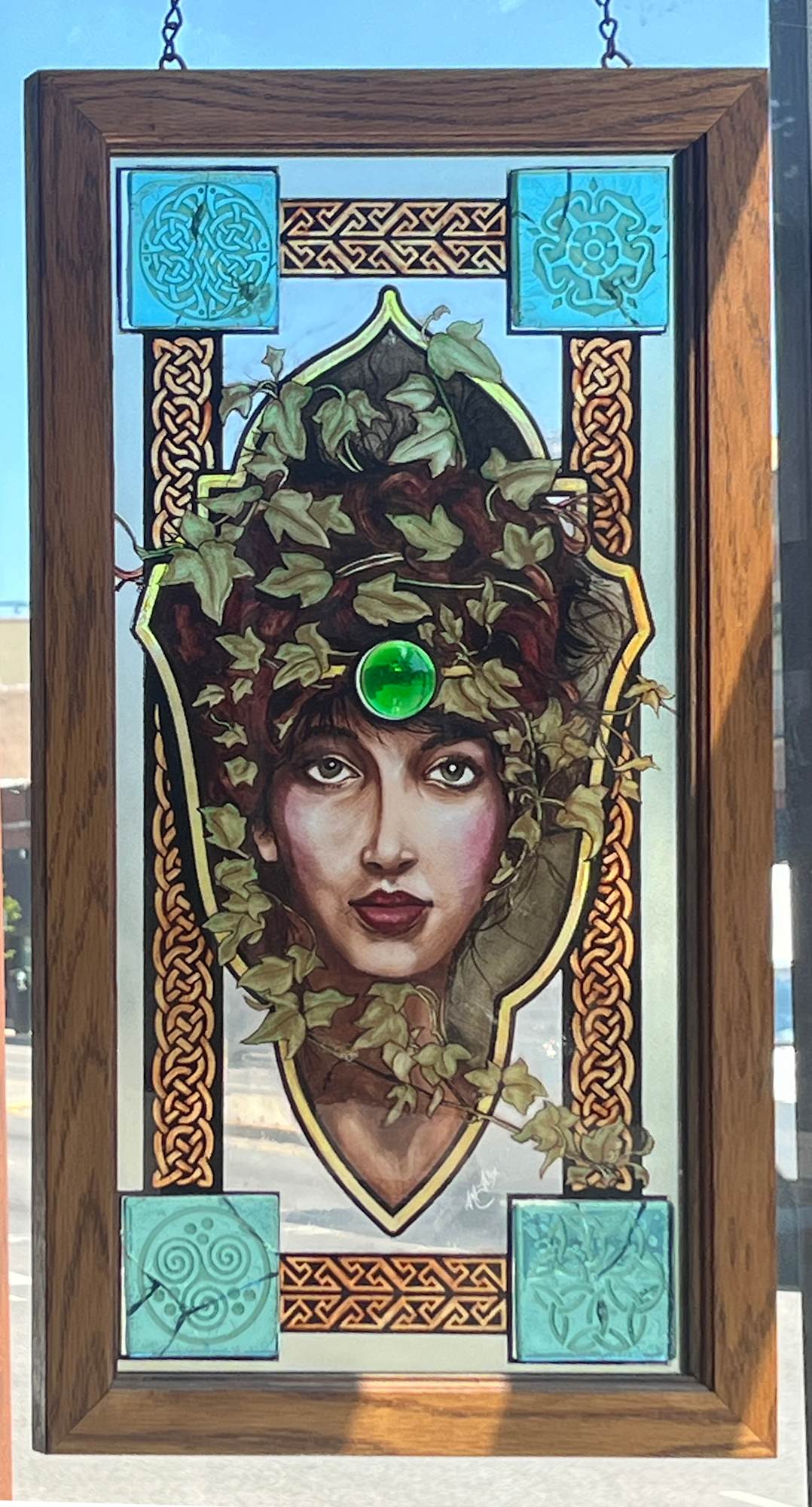 Fire painted glass with laminated glass tiles & emerald glass jewel.