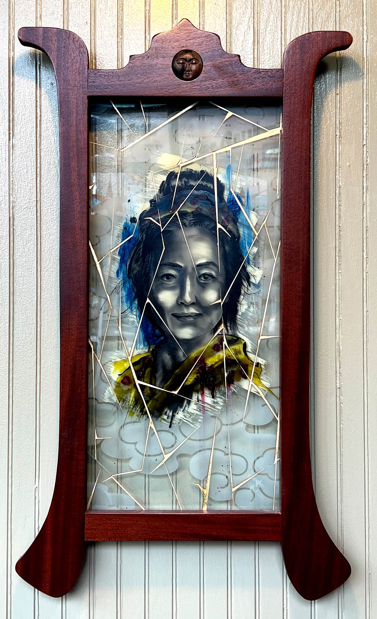 This piece was made by etching, fire painting, and gilding glass. Bespoke frame is made of teakwood.