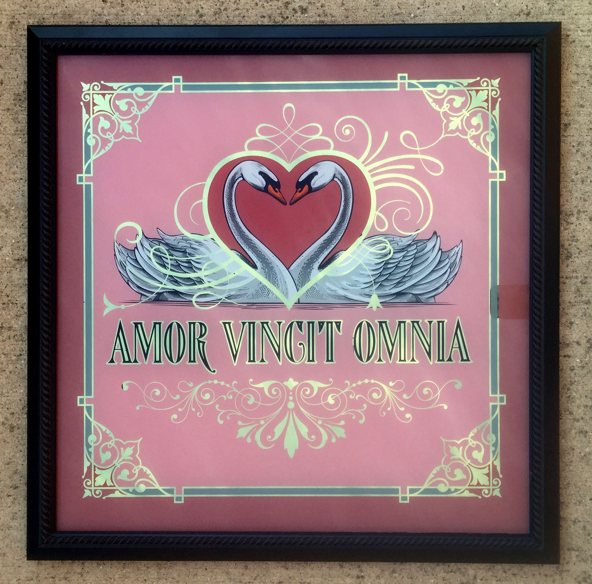 Latin for "Love Conquers All" this glass piece is reverse painted and gilded with 23k gold leaf.