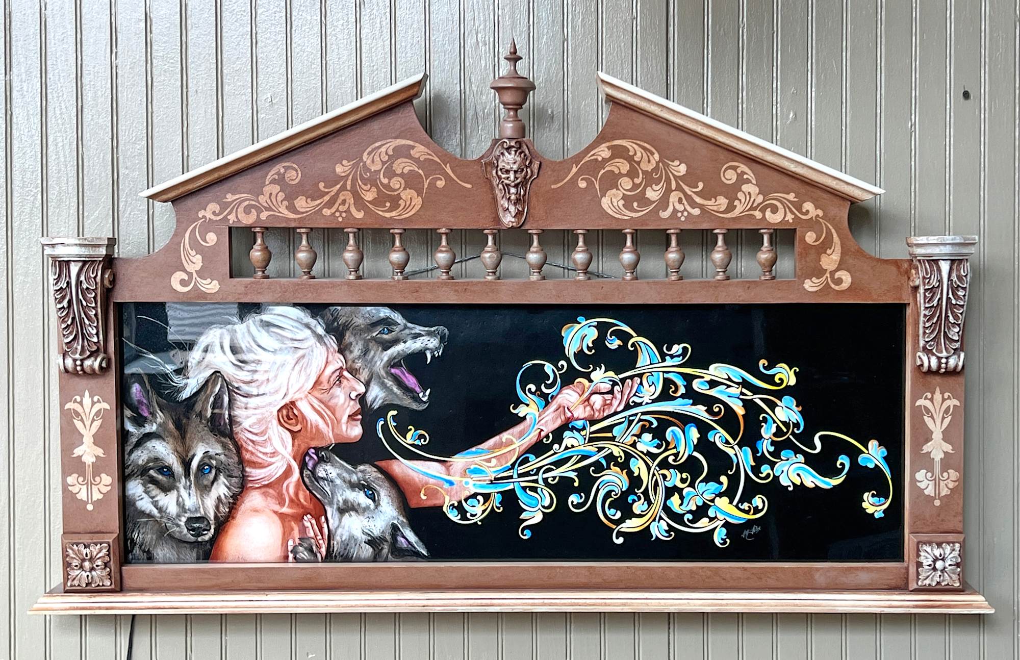 This is a wall mounted installation with fire painted glass illuminated with an LED light panel. The frame is bespoke with painted wood and architectural details.